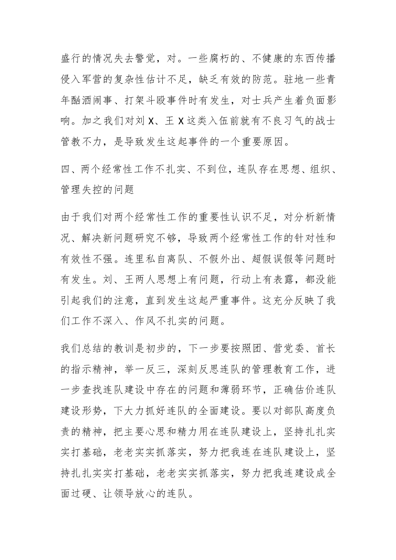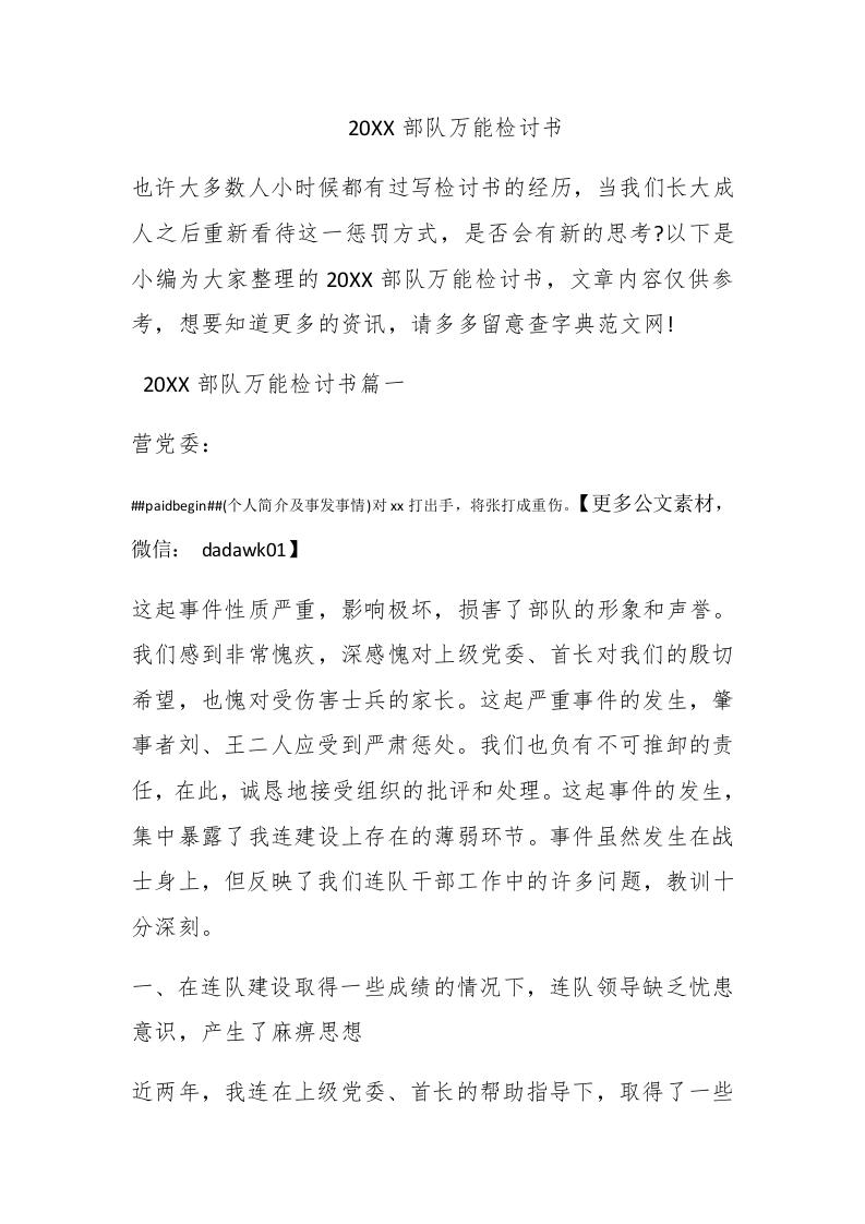 20XX部队万能检讨书也许大多数人小时候都有过写检讨书的经历,当我们长大成人之后重新看待这一惩罚方式,是否会有新的思考?以下是小编为大家整理的20XX部队万能检讨书,文章内容仅供参考,想要知道更多的资讯,请多多留意查字典范文网!20XX部队万能检讨书篇一营党委:郴paidbegin#个人简介及事发事情)对xx打出手,将张打成重伤。【更多公文素材,微信:dadawk01】这起事件性质严重,影响极坏,损害了部队的形象和声誉。我们感到非常愧疚,深感愧对上级党委、首长对我们的殷切希望,也愧对受伤害士兵的家长。这起严重事件的发生,肇事者刘、王二人应受到严肃惩处。我们也负有不可推卸的责任,在此,诚恳地接受组织的批评和处理。这起事件的发生,集中暴露了我连建设上存在的薄弱环节。事件虽然发生在战士身上,但反映了我们连队干部工作中的许多问题,教训十分深刻。一、在连队建设取得一些成绩的情况下,连队领导缺乏忧患意识,产生了麻痹思想近两年,我连在上级党委、首长的帮助指导下,取得了一些