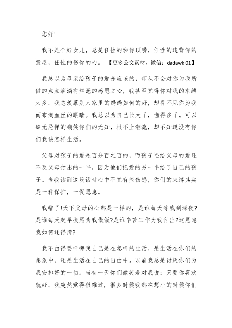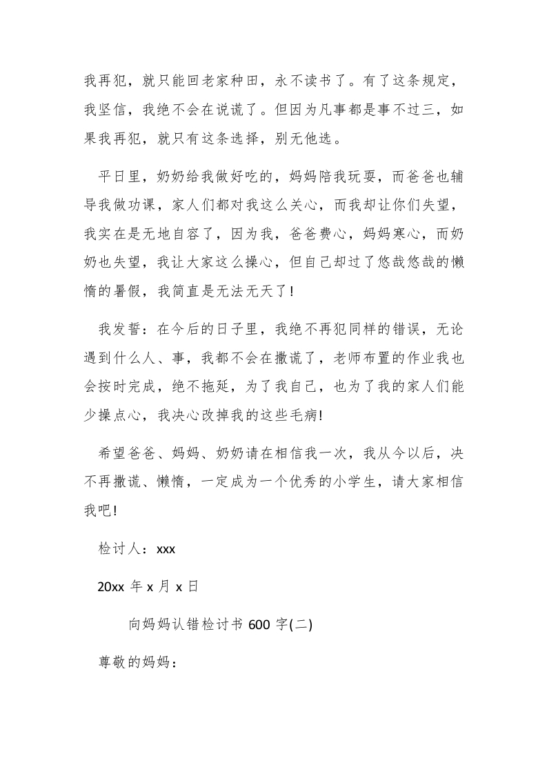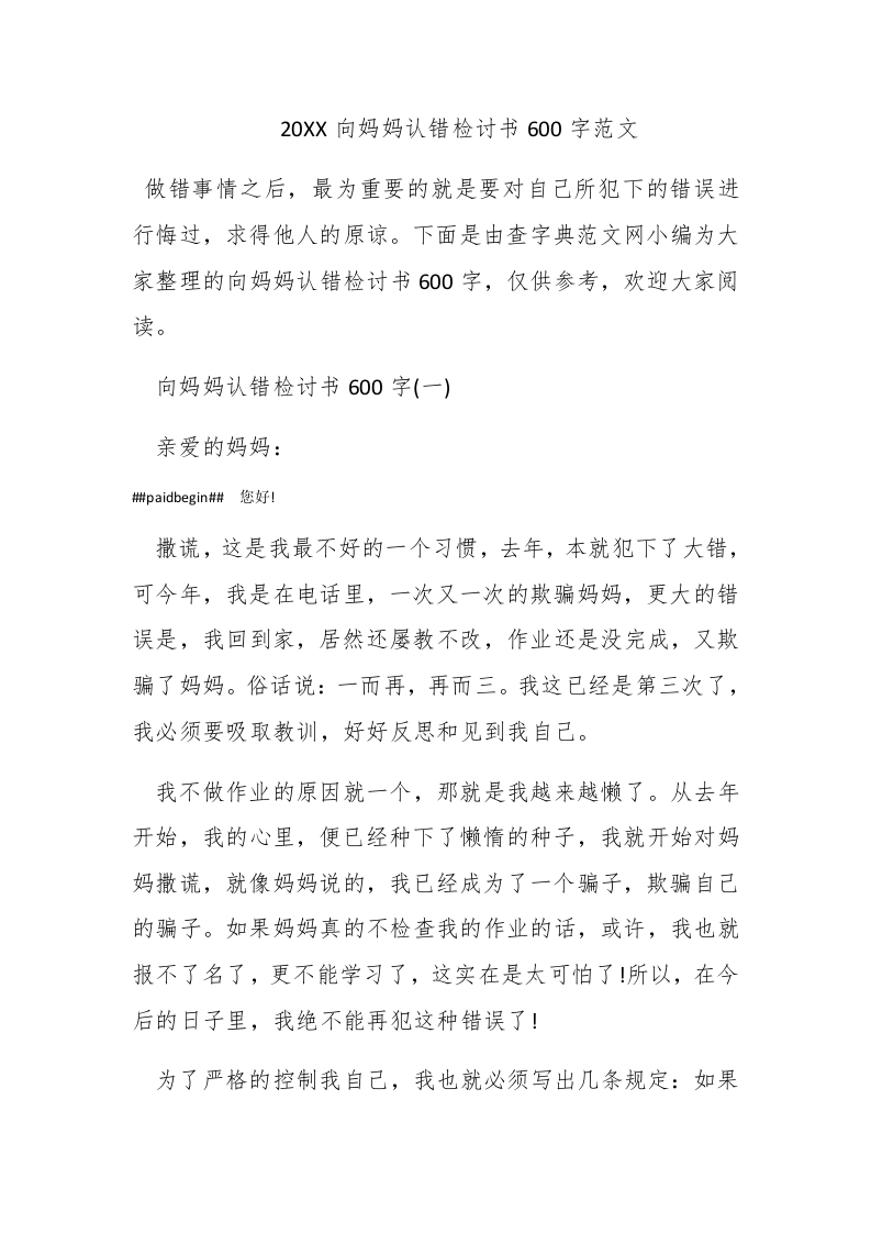 20Xx向妈妈认错检讨书600字范文做错事情之后,最为重要的就是要对自己所犯下的错误进行悔过,求得他人的原谅。下面是由查字典范文网小编为大家整理的向妈妈认错检讨书600字,仅供参考,欢迎大家阅读。向妈妈认错检讨书600字(一)亲爱的妈妈:#paidbegin#您好刊撒谎,这是我最不好的一个习惯,去年,本就犯下了大错,可今年,我是在电话里,一次又一次的欺骗妈妈,更大的错误是,我回到家,居然还屡教不改,作业还是没完成,又欺骗了妈妈。俗话说:一而再,再而三。我这已经是第三次了,我必须要吸取教训,好好反思和见到我自己。我不做作业的原因就一个,那就是我越来越懒了。从去年开始,我的心里,便已经种下了懒惰的种子,我就开始对妈妈撒谎,就像妈妈说的,我已经成为了一个骗子,欺骗自己的骗子。如果妈妈真的不检查我的作业的话,或许,我也就报不了名了,更不能学习了,这实在是太可怕了!所以,在今后的日子里,我绝不能再犯这种错误了!为了严格的控制我自己,我也就必须写出几条规定:如果