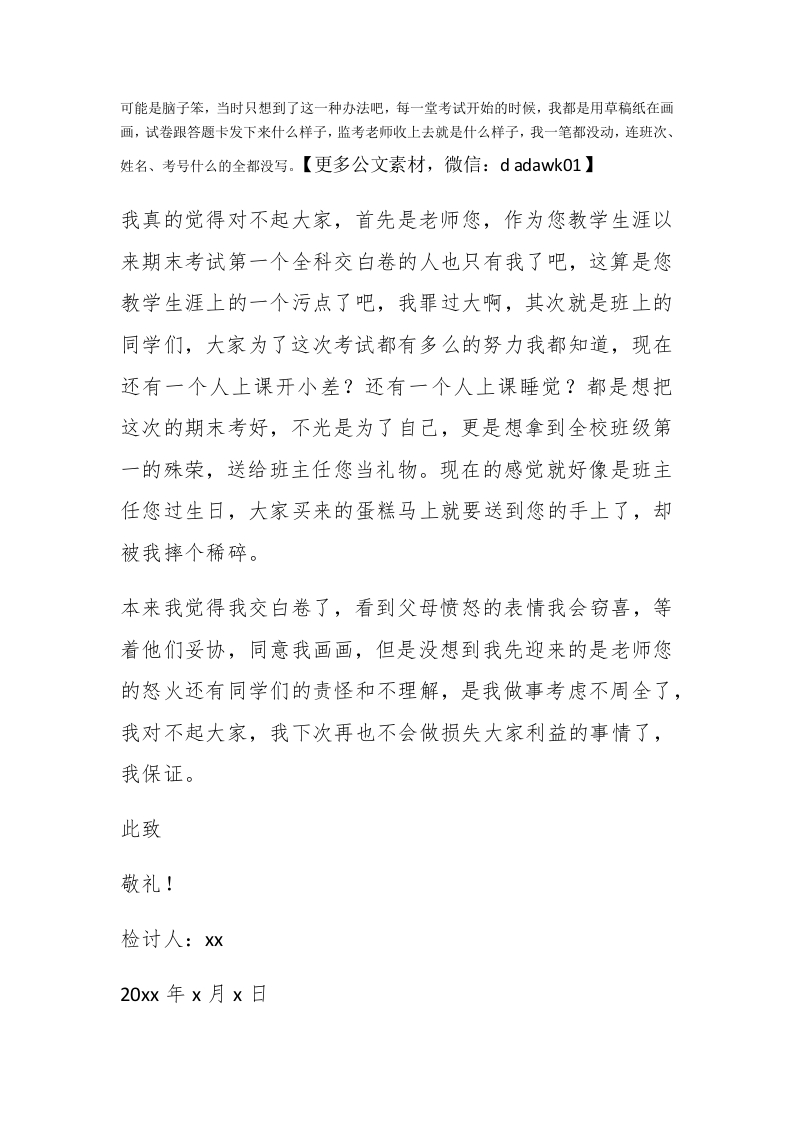 20XX初中学生期末考试交白卷检讨书20Xx初中学生期末考试交白卷检讨书1你们好!我错了,我不该在这次的当中交白卷的,都怪我,凭着自己一己之力把我们班的综合成绩拉到了全校倒数第一,我成了我们班的罪人了,我能看得出老师您是有多生气,都吹胡子瞪眼的对我破口大骂了,口水洗脸我也习以为常了,我惭愧啊,我完全没往这方面考虑,给您班上的造成困扰和麻烦了,我非常抱歉,你们要打要骂,悉听尊便!其实这件事我真的不是故意的,您也知道我的学习成绩一直都不是特别的好,但是也不会特别的差,因为我把心思都放在了画画上,我跟我爸妈商量我要做艺考生,学美术,可是死活不肯,坚持要我走传统的教育路线,还威胁我说,要是不好好读书,以后看到我画画就全给我撕了,但是谁让我是他们的女儿呢,他们性子倔我也不会差到哪里去,这次期末考试只是我的一种抗议的方式,我要让他们妥协,对于他们而言我是故意交白卷的,但是对于你们大家我真的不是故意的,我完全把这件事给忘了,忘了期末算综合成绩的时候要把班上每一个学生的成绩都算进去的,我这样以来至少让我们班上少了几百分啊。七科,我再怎么差也能拿个四百分吧,我们班要是加上这四百分再去算,稳坐校园第一啊。郴paidbegin#我也不知道我为什么要用这种方式会跟父母作对,明明还有好多其他的办法,