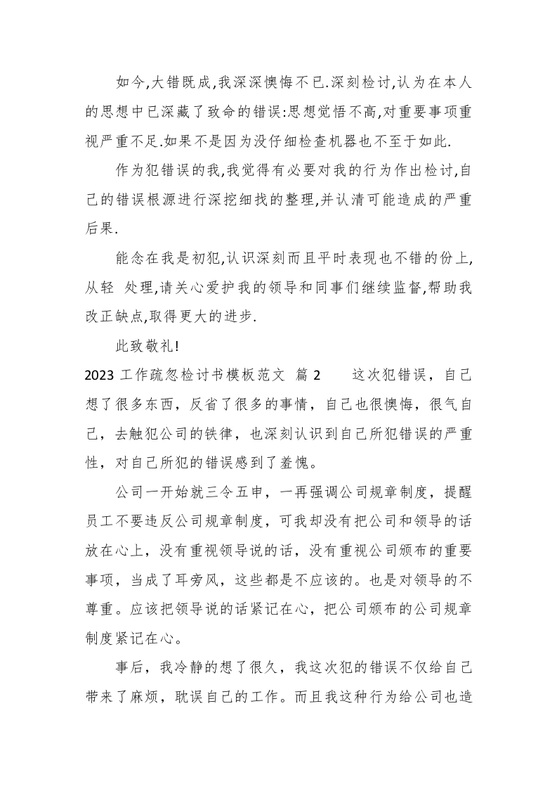 2023工作疏忽检讨书模板范文此内容为付费资源,请付费后查看