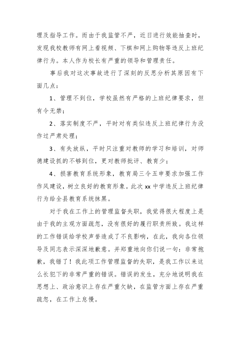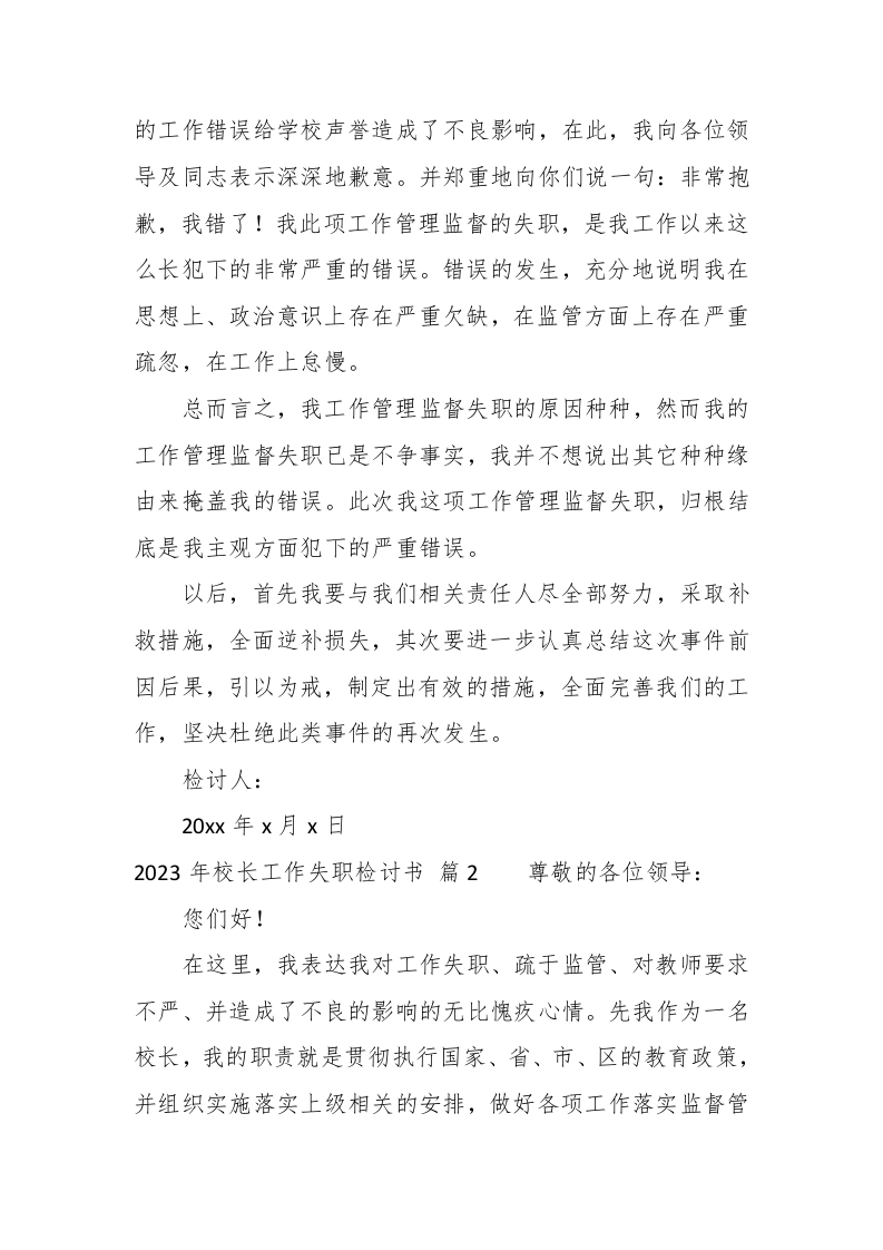 2023年校长工作失职检讨书2023年校长工作失职检讨书(精选26篇)2023年校长工作失职检讨书篇1尊敬的各位领导:您们好!在这里,我表达我对工作失职、疏于监管、对教师要求不严、并造成了不良的影响的无比愧疚心情,首先我作为一名校长,我的职责就是贯彻执行国家、省、市、区的教育政策,并组织实施落实上级相关的安排,做好各项工作落实监督管理及指导工作。而由于我监管不严,我校五年级一班三名学生于4月26日晚9点左右出走,宿舍管理人员直到第二日早晨6点才发现。事后学校迅速上报学区,及时联系家长,校务会成员亲自外出寻找,并联系派出所进行协查。4月27日下午找到一人,其他两人于5月5日找到。虽然学生成功找回,并且未受到任何伤害,但在社会上造成的不良影响确实严重的。事后我对这次事故进行了深刻的反思分析其原因有下面几点:1、本人在思想上没有重视此项工作,平时也很少过问2、平时对宿舍管理人员要求不严,对宿舍管理疏于监管3、对班主任工作抓得不严,班级管理流于形式对于我在工作上的管理监督失职,我觉得很大程度上是由于我的主观方面疏忽,没有很好的履行职责所致。我这样
