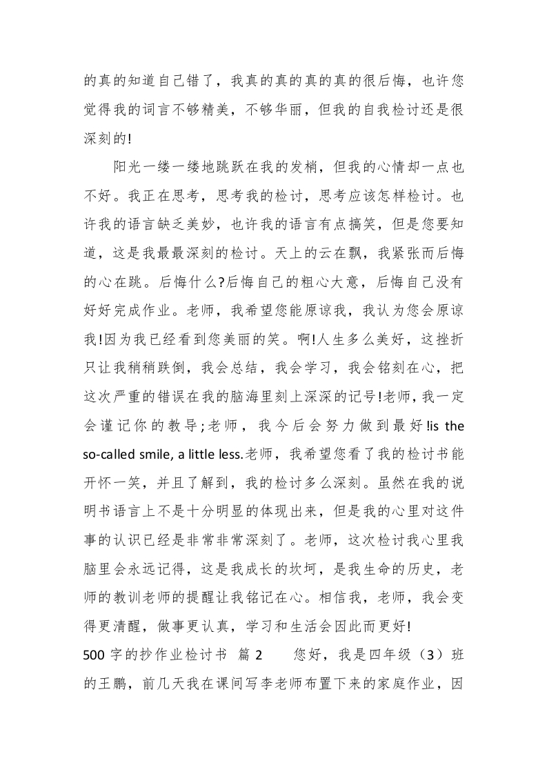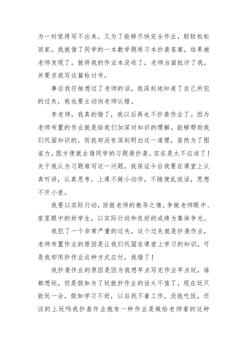 500字的抄作业检讨书500字的抄作业检讨书(精选29篇)500字的抄作业检讨书篇1对不起老师!我下次再也不敢了。我以后会头悬梁,锥刺股,力求您的信任放心吧,我不会再犯这种错误了。老师,我知道这样是错的了,这样对我一点好处也没有,只会害了我自己。我以后一定好好学习,天天向上,不会在有这种可耻的行为。这是本学期我第一次做作业抄答案,我心里很惭愧。造成这个严重的结果我心里很不是滋味。昨天下午,我在抄答案的时候粗心大意,东张西望,心不在焉,以致于自己全抄啦,况且其他同学都抄我的,才造成了这个严重的后果。今天作对的同学很多,老师很生气,后果很严重。唉!都怪我粗心大意,如果我不是不认真,千错万错都是我的错,怨天怨地终要怨自己,就像那句经典台词说的一样:if god give me achance,i am willing to conscientiously,carefully,eyes wideopen,to do their job!就像一个电视剧名称一样:《对不起,我错了!》明明知道这句话已使老师您耳茧重重,但是我不得不说,因为再没有一句话更能准确地表达我内心的愧疚了。您现在肯定眉头紧皱、心里生气十分,我现在心里也是酸酸的、苦苦的,不是滋味。该忏悔的在以前的说明书中我都讲过了,现在不得不再温习一遍:学习要细心,要学会负责。现在自己不得不拿那些陈词滥调来说:老师,我真的真的真