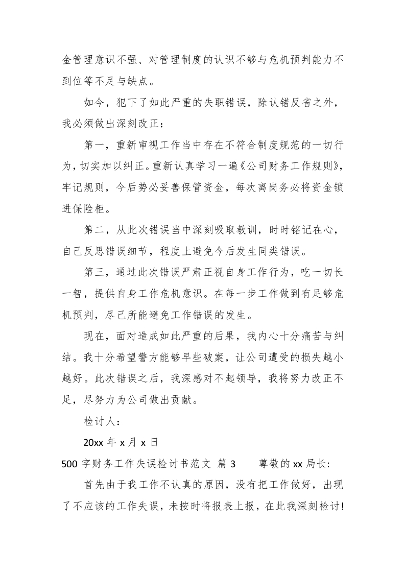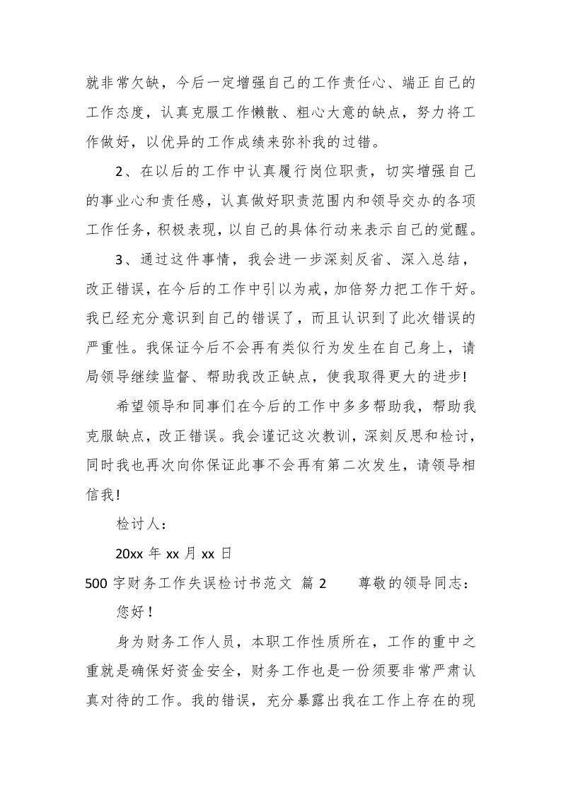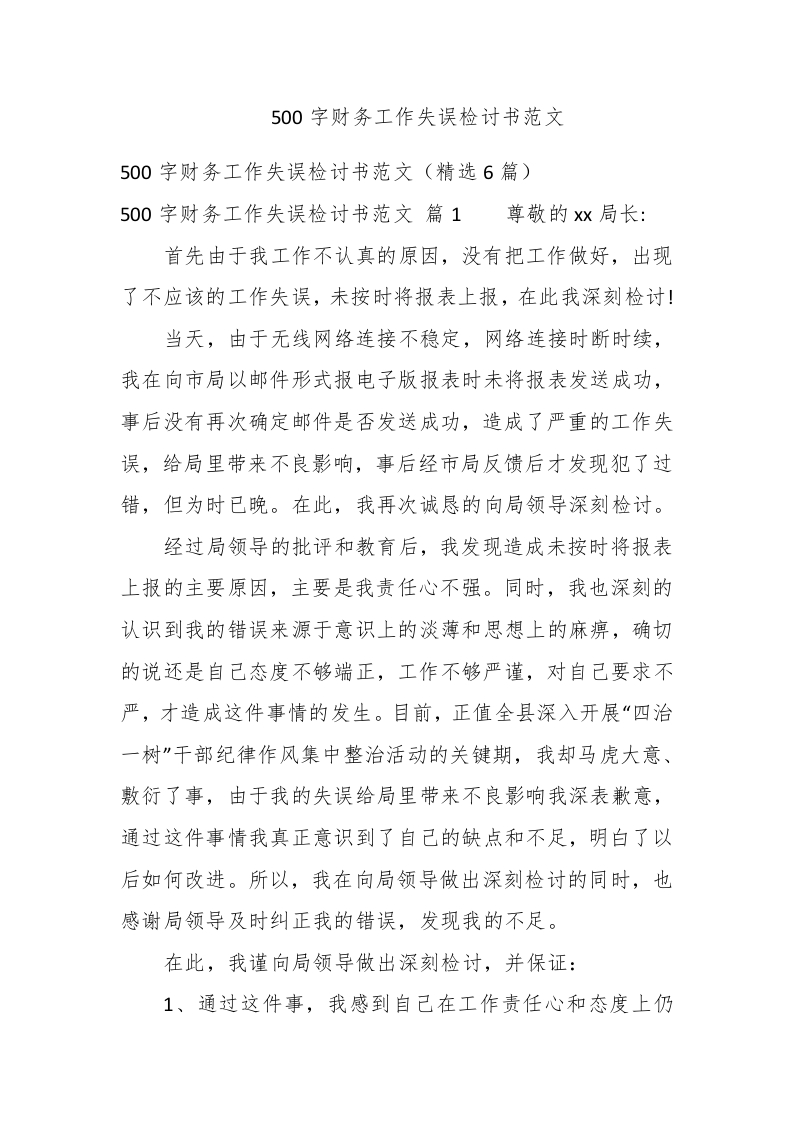 500字财务工作失误检讨书范文500字财务工作失误检讨书范文(精选6篇)500字财务工作失误检讨书范文篇1尊敬的x局长:首先由于我工作不认真的原因,没有把工作做好,出现了不应该的工作失误,未按时将报表上报,在此我深刻检讨!当天,由于无线网络连接不稳定,网络连接时断时续,我在向市局以邮件形式报电子版报表时未将报表发送成功,事后没有再次确定邮件是否发送成功,造成了严重的工作失误,给局里带来不良影响,事后经市局反馈后才发现犯了过错,但为时已晚。在此,我再次诚恳的向局领导深刻检讨。经过局领导的批评和教育后,我发现造成未按时将报表上报的主要原因,主要是我责任心不强。同时,我也深刻的认识到我的错误来源于意识上的淡薄和思想上的麻痹,确切的说还是自己态度不够端正,工作不够严谨,对自己要求不严,才造成这件事情的发生。目前,正值全县深入开展“四治一树”干部纪律作风集中整治活动的关键期,我却马虎大意、敷衍了事,由于我的失误给局里带来不良影响我深表歉意,通过这件事情我真正意识到了自己的缺点和不足,明白了以后如何改进。所以,我在向局领导做出深刻检讨的同时,也感谢局领导及时纠正我的错误,发现我的不足。在此,我谨向局领导做出深刻检讨,并保证:1、通过这件事,我感到自己在工作责任心和态度上仍