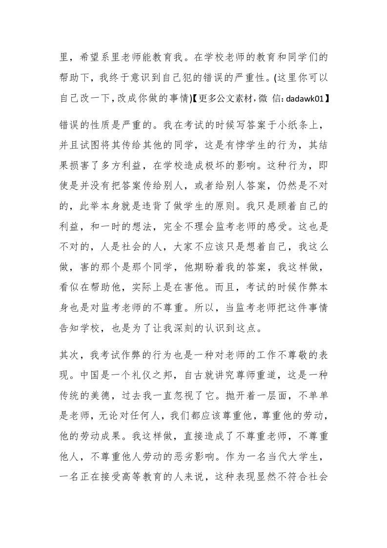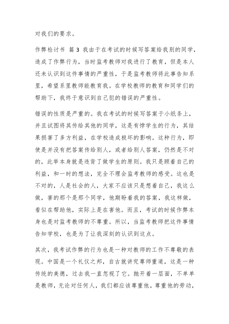 【实用】作弊检讨书模板汇总6篇【实用】作弊检讨书模板汇总6篇在不小心犯错后,为了避免再犯,往往被要求写检讨书来自我检讨,在写检讨书的时候,我们的用语要非常注意。什么样的检讨书才是好的检讨书呢?以下是小编精心整理的作弊检讨书6篇,欢迎阅读,希望大家能够喜欢。作弊检讨书篇1我是临床系08级三班的学生,由于在今天的四级考试中利用飞信接收答案已构成作弊行为,被监考老师当场抓获,被抓后我无心考试想的很多,知道自己已经放的一个很大的错误,将会面对什么,但是我知道不管会接受到什么处分我都会接受。脚paidbegin#我知道我今天的行为不光彩,就算过的又怎么样,想到被人都是自己的努力才拿到证书,而我却是通过不光彩的方法拿到一张空的证明书。我今天的行为不仅是我自己阴影,也给我们系丢脸的,想到我们班的同学他们平时多么努力的复习英语,而我考试却投机取巧心存侥幸想蒙骗过关。最后沦为这种地步也是自找的。让自己成为的一个不诚实的人。天网恢恢,疏而不漏。首先感谢黄主任对我们学生负责监考严明,让我认识的自己的错误,让我能早点改正。还要上系领导道歉款,因为我的事情让我,在你们百忙之中来打扰你们。谢谢你们的教育我会好好改正不会让你们失望,在以后的日子里希望你们多多指导,我相信在你们的教育和指导下我会一步步成为一个优秀的大学生,一个合格的社会公民。【更多公文素材,微信:dada wko1】作弊检讨书篇2我由于在考试的时候写答案给我别的同学,造成了作弊行为,当时监考老师对我进行了教育,但是本人还未认识到这件事情的严重性,于是监考老师将此事告知系
