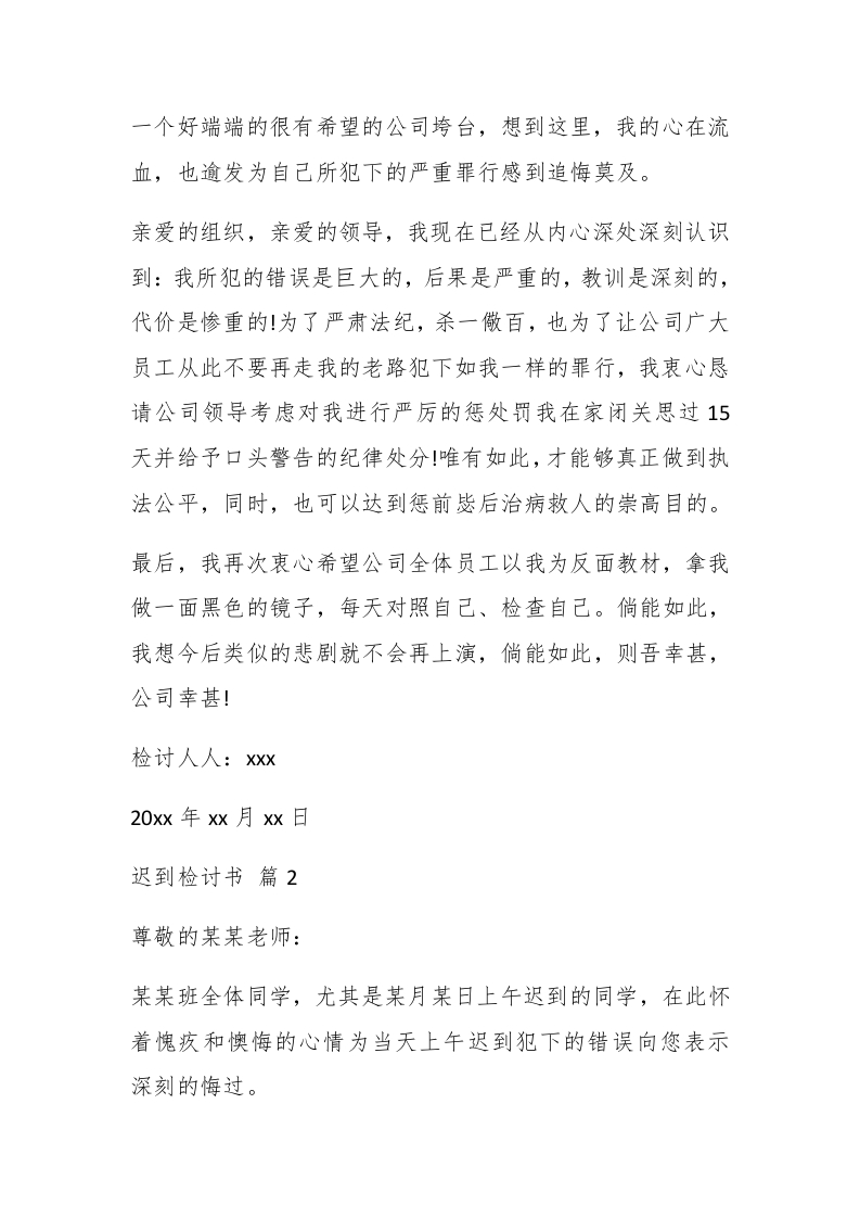 【实用】迟到检讨书范文八篇【实用】迟到检讨书范文八篇在学习、工作或生活中出现了问题或过错后,需要写检讨书来好好地检讨,在写检讨书时要注意用语,切忌自由散漫。其实很多朋友都不知道怎么写检讨书吧!以下是小编为大家整理的迟到检讨书8篇,供大家参考借鉴,希望可以帮助到有需要的朋友。迟到检讨书篇1擗paidbegin#20xx年×月×日,我没能按照公司规定的时间(早晨9点15分前)赶到公司,抛除一切所谓的客观原因诸如家住的太远、身体不适、公共汽车时间不好掌握等等,我个人认为这是主观上长期以来在我头脑中形成的严重资产阶级自由化思潮极端泛滥的结果,这种不良思潮泛滥的最直接表现就是自由散漫,把个人的困难凌驾于公司组织原则之上,置广大公司员工的集体利益于不顾,置公司领导班子的威信尊严于不顾:置我们公司的企业文化宗旨于不顾:自私自利、自我放纵、丢弃原则、利欲熏心我对我个人所犯下的这个严重错误感到痛心疾首,感到无比遗憾,感到非常可耻,感到无以复加的后悔与悲痛。此时此刻,我流着眼泪,带着无比悔恨的心情,默默地想:我个人的这次错误,与其说是错误,不如说是罪行。是的,我是在犯罪啊!如果公司每位员工都像我一样迟到那么几小时,全体员工加起来就会迟到好几十个小时,我们一天的工作就不要干了。如果我们每天都这样,那我们一年的工作也就不要干了。如果我们每年都这样,公司也就会从地球上消失,这是多么严重而可怕的后果啊!由于我个人迟到那么几十分钟,就有可能导致全体公司员工丢掉饭碗,就有可能导致
