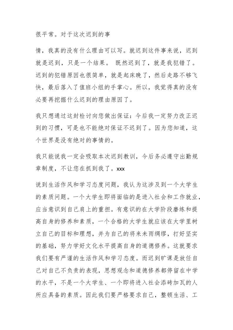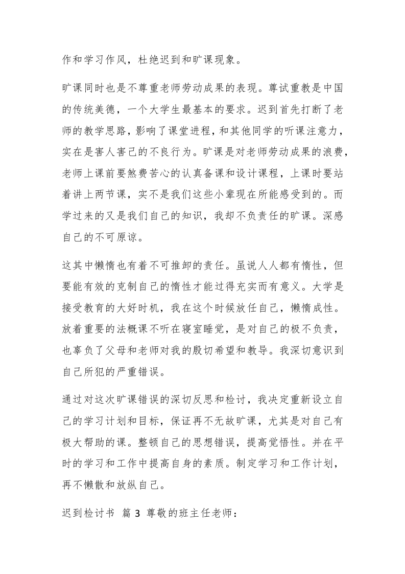 【实用】迟到检讨书集合7篇在学习或工作出现失误以后,要求以书面的形式,对自己的行为作出检讨,我们写检讨书是为了警醒自己,千万不能马虎应付。其实很多朋友都不知道怎么写检讨书吧!下面是关于迟到检讨书7篇,仅供参考,欢迎大家阅读。迟到检讨书篇1尊敬的老师:今天,我怀着十二万分的愧疚以及十二万分的懊悔给您写下这份检讨书,以向您表示我对上课迟到的这种恶劣行为的深痛恶绝及打死也不再犯的决心。#paidbegin#早在我刚踏进这个班级的时候,您就己经三令五申,一再强调,全班同学,上课要认真听讲,不能做违反纪律的事。其时,老师反复教导言犹在耳,严肃认真的表情犹在眼前,我深为震撼,也己经深刻认识到此事的重要性。我今后一定不再迟到不再违纪,不辜负老师对我们的一片苦心。检讨人:Xx迟到检讨书篇2尊敬的值班老师:您好,非常抱歉,我上学迟到了,而且恰好落入了您的手掌心。很幸运让您认识了我,我真的不知道该说什么好,或许我说多了,您也会以为我是在狡辩。我不是一个学习成绩好的学生,成绩比较中等,在校表现也