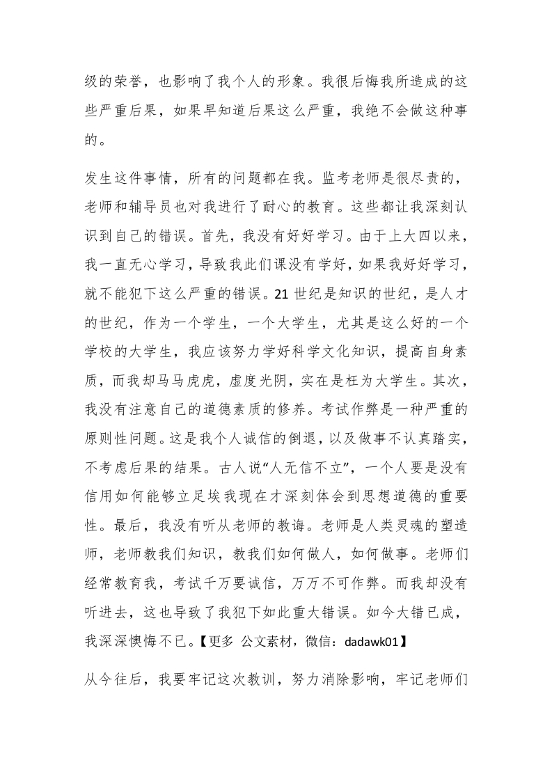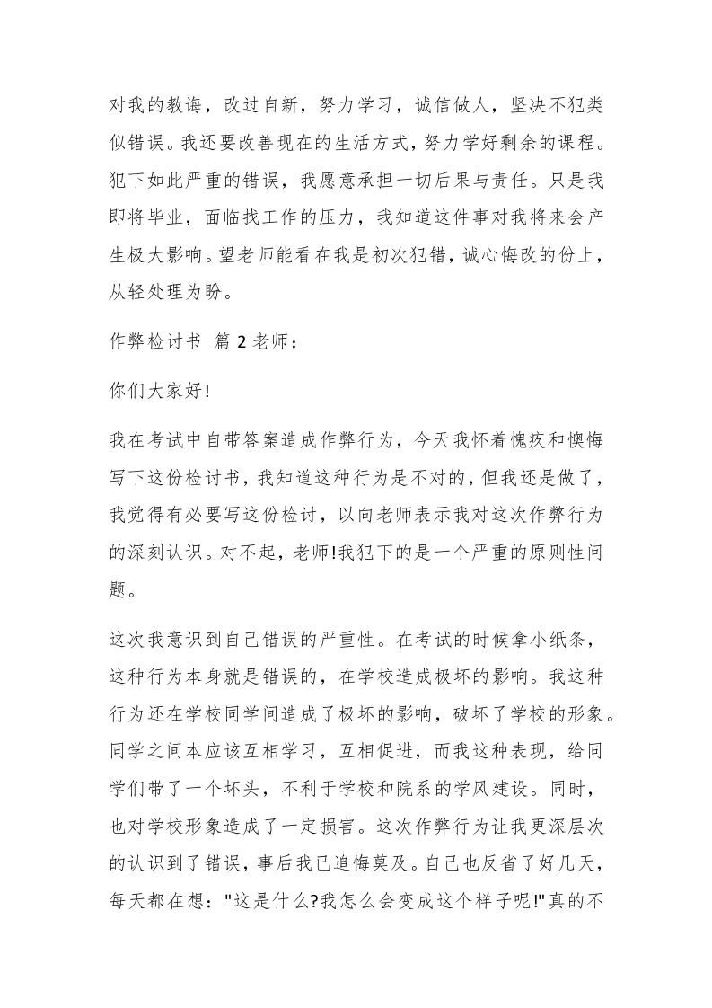 【必备】作弊检讨书四篇【必备】作弊检讨书四篇在不小心犯错后,为了避免再犯,需要写检讨书来好好地检讨,在写检讨书的时候要注意态度要诚恳、端正。相信很多朋友都对写检讨书感到非常苦恼吧,以下是小编为大家整理的作弊检讨书4篇,仅供参考,希望能够帮助到大家。作弊检讨书篇1尊敬的老师:郴paidbegin#由于我在考试的时候使用小纸条传答案,造成严重的作弊行为。今天,我怀着无比愧疚和懊悔的心情在此做深刻的检讨。事情经过是这样的。20xx年12月10日上午,数学考试。由于这门课平时没有学好,加上考试前复习不充分,等到快考试的时候,我还有很多东西没记好,等到考试的时候,我发现很多题目都不会做,我一时糊涂,就用小纸条向同学发了考题,希望他能给我发答案。正在这时,老师您发现了我的行为,就将我的小纸条和卷子一起没收了。当时我脑中一片空白,心中涌起愧疚,后悔,不安各种情绪。回来后我寝食难安。然后江辅导员找我谈过了话,我才认识到自己犯下了一个极大的错误。对不起!我不仅对不起长期默默支持我的家人,对不起和我同甘共苦的同学,更对不起细心教导我的老师,辅导员。我的作弊行为严重影响了考试的公平,影响了学校,学院和班
