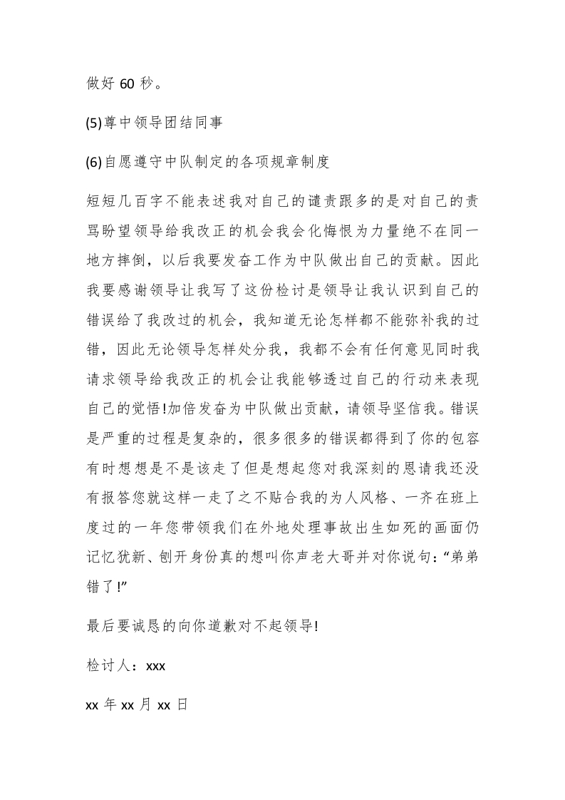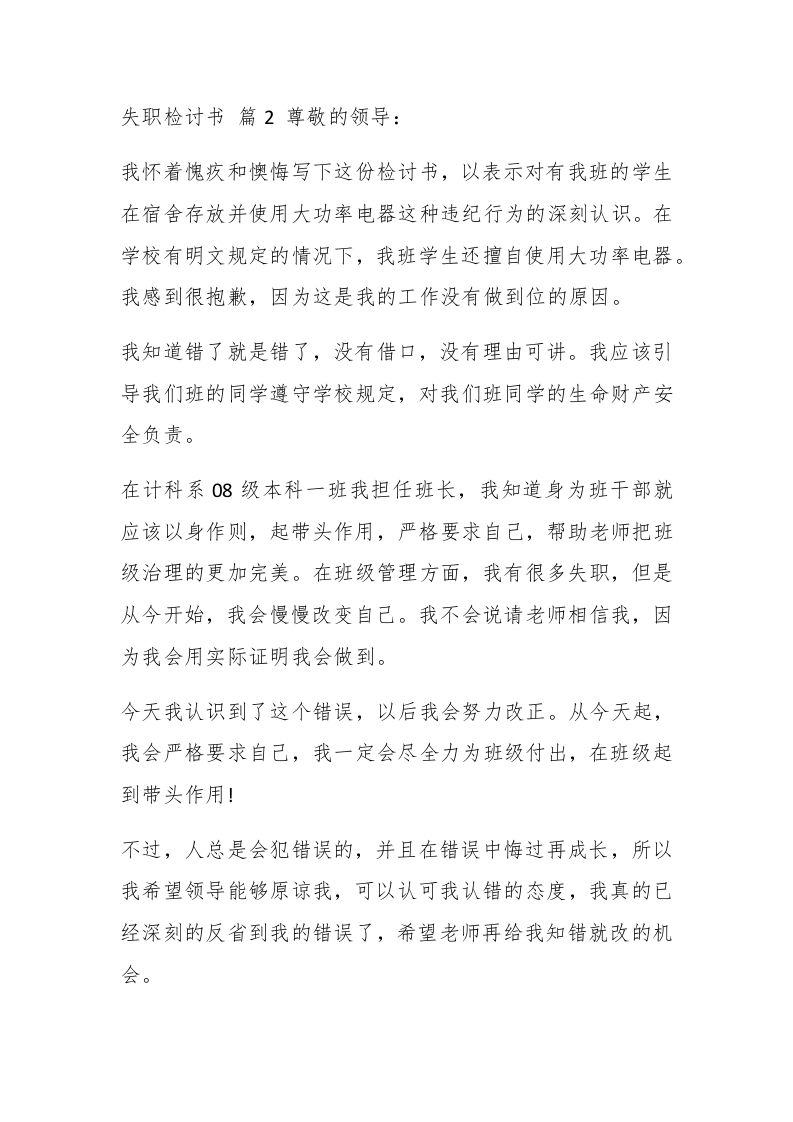 【必备】失职检讨书模板六篇【必备】失职检讨书模板六篇在学习、工作或生活中出现了过错后,为了避免再犯,我们常常被要求写检讨书,以对出现的过错进行反省,请注意写检讨要把原因讲清楚。怎样写检讨书才能做到语言准确呢?以下是小编精心整理的失职检讨书6篇,供大家参考借鉴,希望可以帮助到有需要的朋友。失职检讨书篇1尊敬的队长:郴paidbegin#您好I感谢您在百忙之中抽空看我的检讨书l我不想在为我的错误找任何借口,那只能让我更加惭愧、因此我下定决心不再犯类似错误。透过这几天的反思,我对自己这一年工作成长经历进行了详细回忆与自我检讨。对不起领导对我的信任、愧对领导对我的关心跟为重要的是与领导之间的误会,这让我深深的懊悔不已!因此在新的一年里做出以下规划。(1)认真克福生活懒散粗心大意的缺点发奋将工作做好以优秀的表现来弥补我的过错。(2)经常和老队员老大哥们沟通保证不再出现类似错误。(3)自觉学习业务时刻不忘自己的工作(4)时刻不网自己的职责要尽责的做好工作做到上岗一分钟