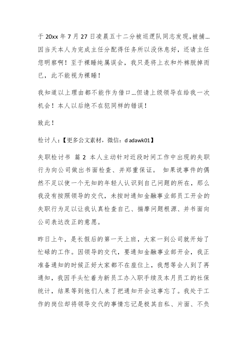 【必备】失职检讨书范文汇编8篇【必备】失职检讨书范文汇编8篇在不小心犯错后,为了避免再犯,需要写检讨书来好好地检讨,请注意检讨书里面要交代清楚行为。大家知道正规的检讨书怎么写吗?以下是小编精心整理的失职检讨书8篇,欢迎阅读,希望大家能够喜欢。失职检讨书篇1尊敬的上级领导:#paidbegin#本人徐某对20xx年7月26日晚在岗偷懒事件作出检讨,本人深知做为秩序管理人员,在岗睡觉后果严重,裸睡者更严重。但请领导听我对此次事件的解释,本人先解释睡觉原因。因这几天下班后主任您要求每个宿舍都需要整理,因我宿舍就我一人上夜班所以就我一个人整理,您是知道得,我有舍友四人加我五人,我七点下班,洗完澡衣服就到八点了,您却还要我帮同事整理被套,还要叠豆腐状得,本人经一番努力终于在十二点半完成任务,但因体力消耗过大,本人于一点整到饭堂吃饭,在一点半回到宿舍,正要休息可是您又来了!你又说在把宿舍卫生搞一下,我忍不住问了下,今天是什么日子,您回答:总部派人来检查。我无语,你走后我在五点半终于搞完。刚准备睡觉,可是又到吃饭时间了!我在六点回到宿舍,王督导来了,他说领导今天不来了,我彻底无语!我一直到到十一点上班才回过神来。