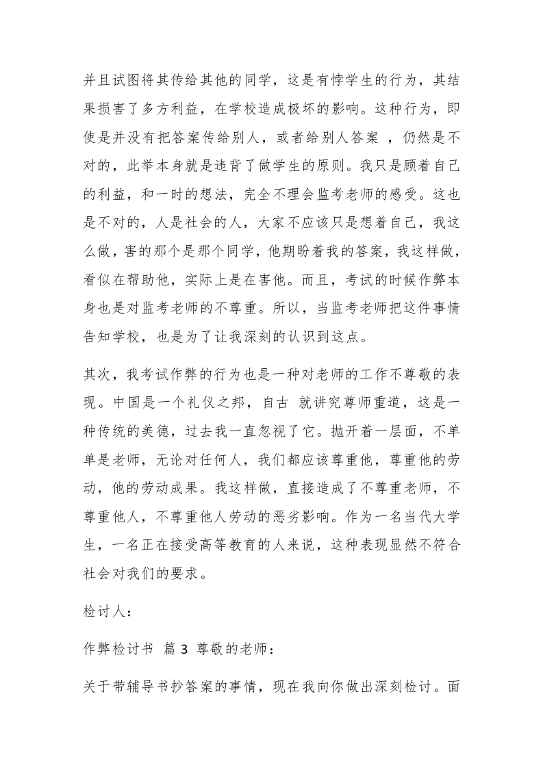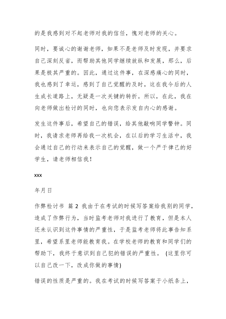 【推荐】作弊检讨书范文集锦7篇【推荐】作弊检讨书范文集锦7篇在学习、工作或生活中出现了过错后,为了避免再犯,常常要求写检讨书,以对出现的过错进行悔过,请注意检讨书里面要交代清楚行为。怎样写检讨书才能做到语言准确呢?下面是小编为大家整理的作弊检讨书7篇,供大家参考借鉴,希望可以帮助到有需要的朋友。作弊检讨书篇1敬爱的X老师:郴paidbegin#我怀着十二万分的愧疚以及十二万分的懊悔向你们写下这份检讨书,我为自己的行为感到了深深地愧疚和不安,在此,我向老师做出深刻检讨:通过这件事,我感到这虽然是一件偶然发生的事情,但同时也是长期以来对考试纪律不重视的必然结果。自己身为学生,应该严以律已,对自己严格要求!然而自己却不能正确地帮助同学,给其他同学带来了恶劣的影响:虽然自己并非有意。可是,由于自己的错误,给学校风气带来了严重的不良影响,后果不堪设想~这也说明,我对自己的学习生活没有足够的自律心,也没有把学校要求切实做到,没有真正理解学校和老师良苦用心。在自己的思想中,没有对义气有真正的理解。现在,我深深感到,这是一个非常危险的倾向,也是一个极其重要的苗头。因此,这次发生的事使我不仅感到是自己的耻辱,更为重要