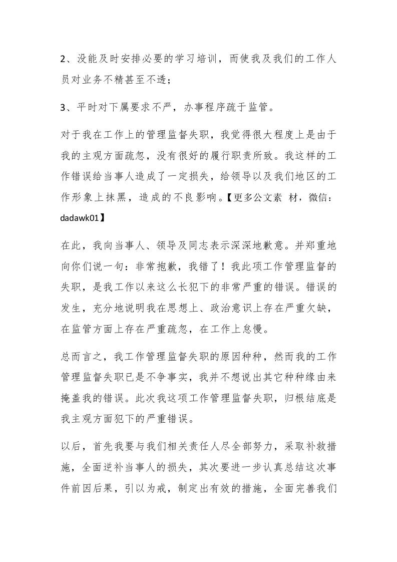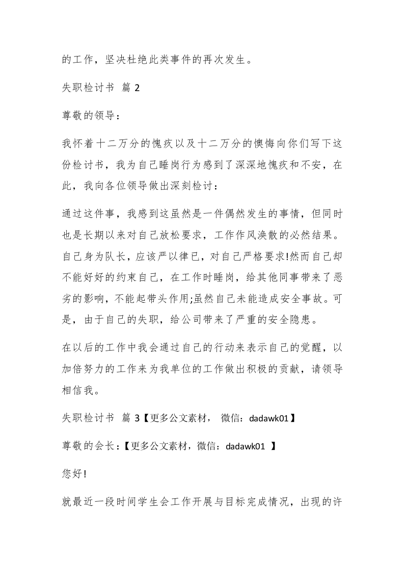【推荐】失职检讨书模板汇总九篇【推荐】失职检讨书模板汇总九篇在不小心犯错后,为了避免今后再出此类事件,我们要通过写检讨书来反省,请注意检讨书里面要交代清楚行为。那么正式、规范的检讨书是什么样的呢?下面是小编为大家收集的失职检讨书9篇,欢迎阅读与收藏。失职检讨书篇1#paidbegin#尊敬的公司领导:您好!感谢您在百忙之中抽空看我写的检讨书!在这里,我表达我对工作失职、疏于监管、对下属要求不严、对业务掌握的不精不透,并给相关当事人造成了一定损失的无比愧疚心情。首先我作为一名科长,我的职责就是贯彻执行国家、省、市、区的法律、法规和政策;并组织实施落实上级相关的法规政策,做好各项程序落实监督管理及指导工作。近期因我们具体工作人员,因业务不熟、责任心不强,而使申报业务出了重大失误。给我们工作及当事人造成了一定的损失。分析其原因有下面几点:1、本人在思想没有重视此项工作,平时也很少过问;