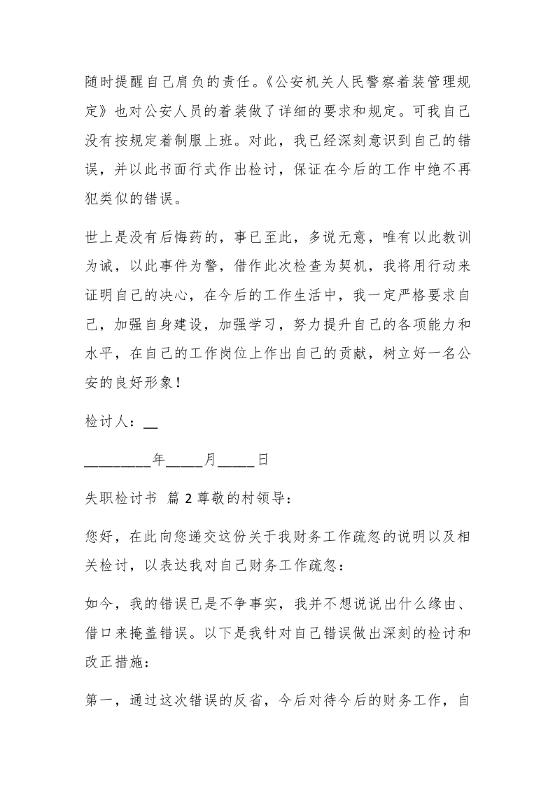 【推荐】失职检讨书模板锦集九篇【推荐】失职检讨书模板锦集九篇在有过错的情况下,为了避免今后再出现此类事件,往往被要求写检讨书来自我检讨,请注意检讨书里面要交代清楚行为。但是你知道怎样才能写的好吗?以下是小编收集整理的失职检讨书9篇,欢迎阅读与收藏。失职检讨书篇1尊敬的各位领导:郴paidbegin#我怀着十分不安及羞愧的心情写下这份检讨书。12月5日那天上午,我由于自身的疏忽,到大队开会却没有穿制服,对此,我十分的自责。作为一名刚上岗的交通警察,连最起码的制服到没有穿,我这样的行为,给单位形象造成了一定的影响,给同事留下了不好的印象,更不利于自身工作的开展以及接受群众的监督。我知道,从古至今,制服大都作为一种身份标志,承载着传达其特定内涵的作用,尤其国家机关工作人员的制服更是权力的一种象征。警服、警车、警察证等作为一种身份标志也正是如此;制服等身份标志对警察行为具有监督意义;警察的权力涉及到生活的很多方面,最贴近人们生活的行政权力越有可能侵犯人们的权利,所以权力需要在阳光下运行。公众的监督被公认为是最有效的方式之一。警服作为警察执法的明显标志,能有效证明其身份,所以身着警服执法的警察能为人们所有效监督。交警作为一个特殊的职业,在工作方面有其特殊性。制服的穿着,有利于我们在工作当中行使自己的权力和义务,更能