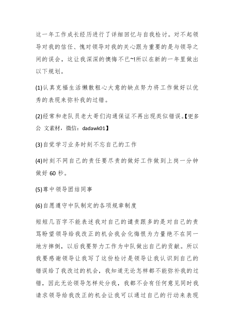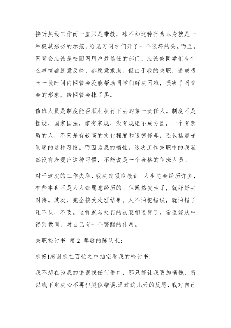 【推荐】失职检讨书模板集合10篇【推荐】失职检讨书模板集合10篇在学习、工作或生活中出现了过错后,往往被要求写检讨书来自我反思,写检讨书尽量要写得深刻诚恳一些。那么正式、规范的检讨书是什么样的呢?以下是小编收集整理的失职检讨书10篇,仅供参考,大家一起来看看吧。失职检讨书篇1距离事情发生快一周了,我一直在反思出这么大的问题的根本原因是什么,我的职责在哪,通过这件事我能得到什么,一系列的问题让我很有必要对自己做出一个深刻的检讨,吃一堑,长一智,举一反三,融汇贯通,作为以后生活学习中的教训。郴paidbegin#首先,承认自己的错误。份内的检查监督事宜没有做好,最大的责任人是我。作为值班人员,有监督的权力和自我监督的义务。正常值班时间应该首先完成值班工作,达到考勤、卫生、工作质量等基本要求。因为我的惰性,未检查是否接通,并且本着逃避工作的思想,在后来发现未接通时,也未提醒另一值班同学接通电话线,试图借助既成事实逃脱责任。值班人员必须强迫自己去主动的想一些问题,去解决一些问题。诚然,平时的工作大都是小问题小事情,技术含量也不高。可只有都把这些小事情做好了,整体情况才能有一个质的提升,更不能人为制造问题。因为我的惰性,认为值班比带教见习同学枯燥,未认真参与