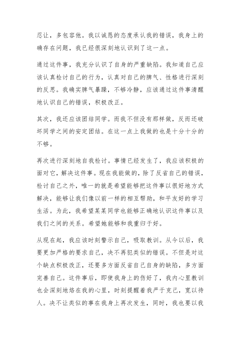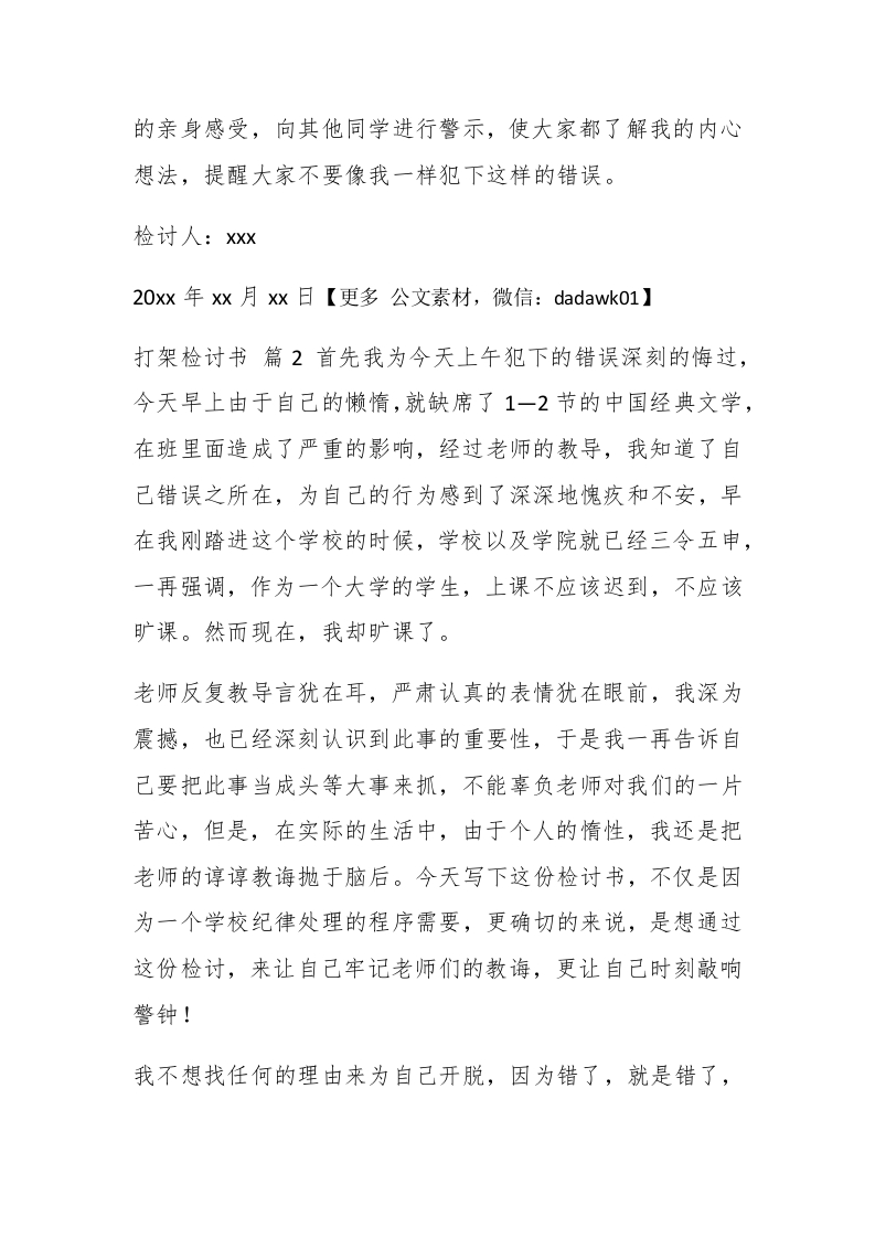 【推荐】打架检讨书模板八篇【推荐】打架检讨书模板八篇在学习、工作或生活中出现了过错后,为了表明自己悔改的决心,我们常常被要求写检讨书,以对出现的问题和过错进行检讨,在写检讨书的时候,我们的用语要非常注意。你还在对写检讨书感到一筹莫展吗?以下是小编精心整理的打架检讨书8篇,欢迎大家分享。打架检讨书篇1尊敬的老师:榭paidbegin#今天我怀着愧疚的心情写下这份检讨书。这次犯错误后,我想了很多东西,反省了很多的事情,自己也很懊悔,很气自己,不该去触犯学校的铁律,也深刻认识到自己所犯错误的严重性,对自己所犯的错误感到了羞愧。学校一开学就三令五申,一再强调校规校纪,提醒学生不要违反校规,可我却没有把学校和老师的话放在心上,没有重视老师说的话,没有重视学校颁布的重要事项,当成了耳旁风,这些都是不应该的。也是对老师的不尊重。应该把老师说的话紧记在心,把学校颁布的校规校纪紧急在心。对于这一切我还将进一步深入总结,深刻反省,恳请老师相信我能够记取教训、改正错误,把今后的事情加倍努力干好。我已经意识到我的错误了,而且认识到了此次错误严重性。我知道我那天确实是太冲动,太不冷静了。我错了,脾气差已经不对,动手打人就更不对了。我应该多为别人着想,多