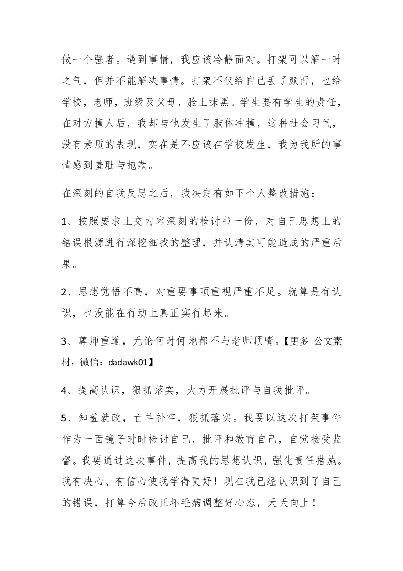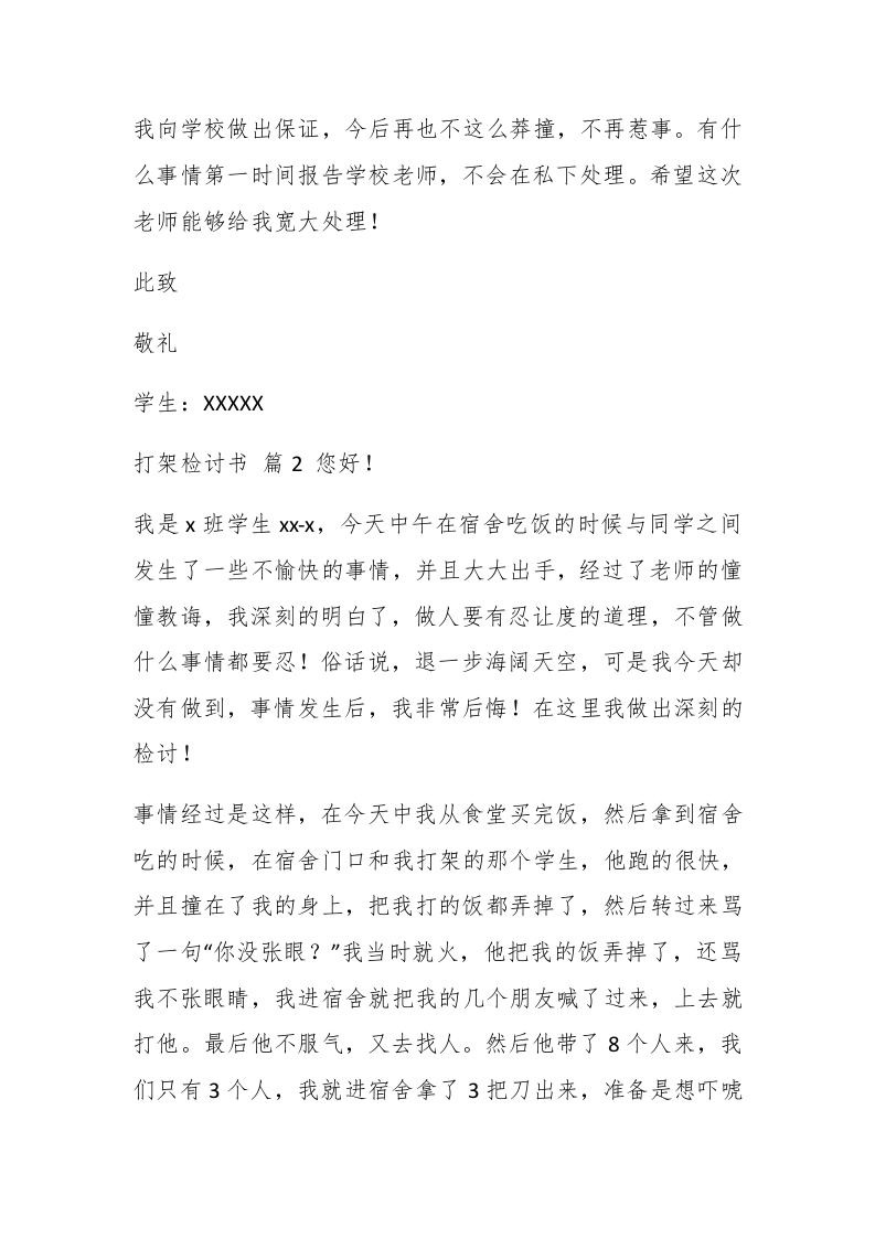 【推荐】打架检讨书范文七篇【推荐】打架检讨书范文七篇在不小心犯错后,为了避免再犯,往往要写检讨书来自我悔悟,请注意检讨书里面要交代清楚行为。其实很多朋友都不知道怎么写检讨书吧!下面是小编收集整理的打架检讨书7篇,希望能够帮助到大家。打架检讨书篇1尊敬的老师:擗paidbegin#您好!我是xx班的xx,我怀着十二万分的愧疚以及十二万分的懊悔写下这份检讨书。以向您表示我对打架这种恶劣行为的深痛恶绝及打死也不再违纪的决心。回想起昨天发生的打架事情,让我后悔不已。作为一名在校学生,打架斗殴实属不对。作为一名学生,就要有学生的样子,团结,友爱,是我们的本分。冲动不能解决任何事情,相反会弄巧成拙,破坏同学关系,失去老师信任。我对我的做法感到愧疚。在此,写此书以示悔过。事情经过是这样的,(说一大堆经过)虽然事情的起因并不在我,但我动手打人,就是我的错。不管发生什么事情,心平气和的讲明白,就可以大事化小,小事化了。多一事不如少一事,作为一个学生,学会学习,并要懂得怎样在生活中