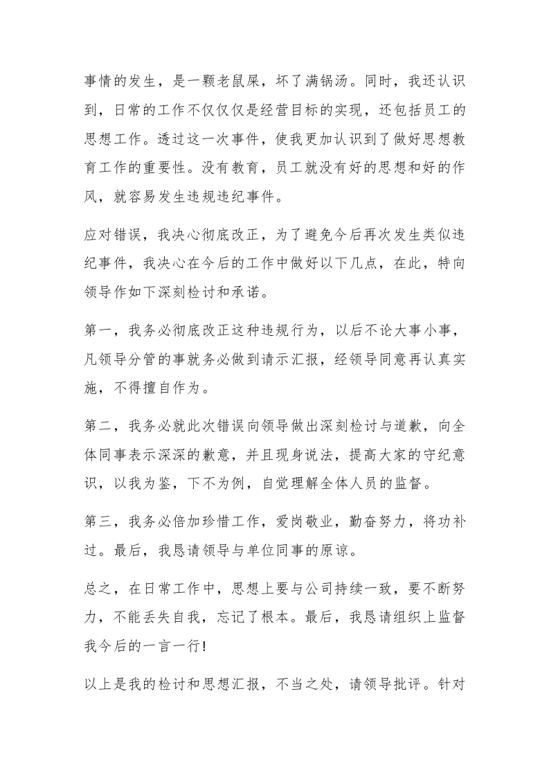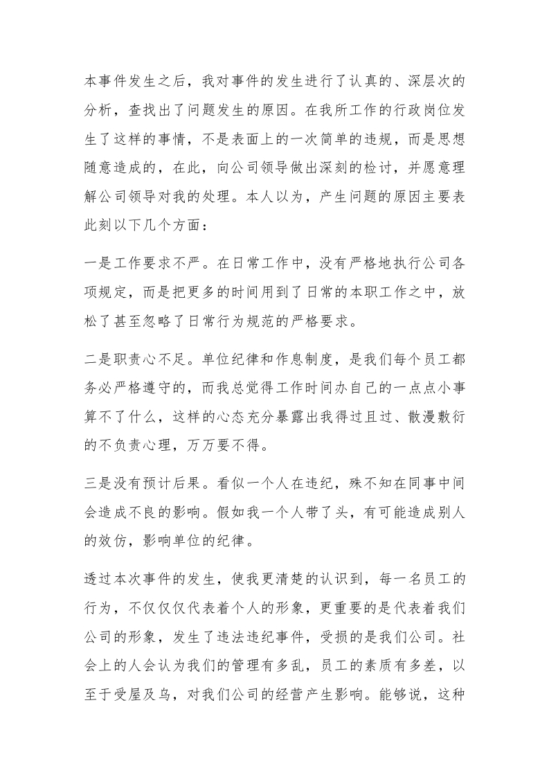 【推荐】违纪检讨书3篇【推荐】违纪检讨书3篇我们在犯错后,避免再次犯错,常常要求写检讨书,以对出现的问题和过错进行检讨,请注意写检讨书要注意正确的格式。还是对检讨书一筹莫展吗?以下是小编为大家整理的违纪检讨书3篇,仅供参考,欢迎大家阅读。违纪检讨书篇1尊敬的部门领导:#paidbegin#7月19日一上班,我就受到领导问责,因为被公司领导查出自作主张,假冒领导在请假条上签了字。原本以为这事算不上什么,但经过反复思量,整个人从上午到此刻一向沉浸在不安之中,我觉得,事件的发生,有违公司制度的执行,作为一家大型国有企业一名行政人员,本应带头遵守公司各项规章,但自己主动犯错,内心久久不能平静并且深怀愧疚之心。记得20xx年进入公司时,我满怀信心和激情。一晃4年过去了,4年来,自己每一天都在和身边的同事努力工作,也从没有过如此念想,没想到如今自己做出了这样的糊涂事来。事情的起因是。因为我身怀有孕,经常要到医院作例行检查,有时不得不请假。公司已经不让我请病假了,都让我请事假。但公司请假原则是,先发邮件请假,然后分管经理一个月左右回上海一次,需要补单子。因为领导来的很匆忙,我也没有及时准备好单子,就拿了事前请假的单子给领导签字了。之后人事催我要请假单子,我就冒充领导签了几个字。【更多公文素材,微信:dada wko1】