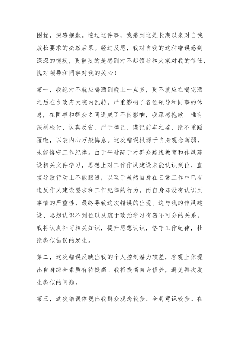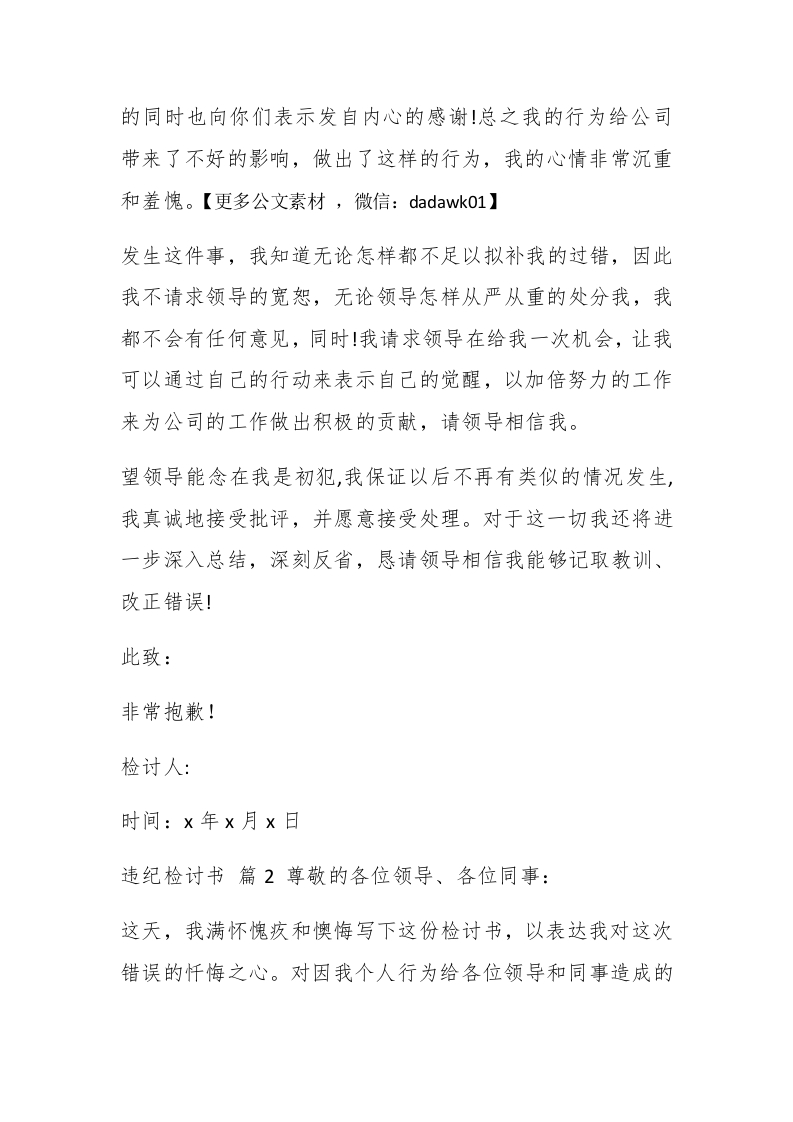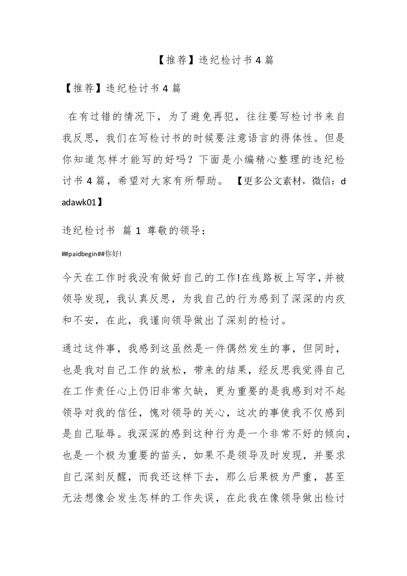 【推荐】违纪检讨书4篇【推荐】违纪检讨书4篇在有过错的情况下,为了避免再犯,往往要写检讨书来自我反思,我们在写检讨书的时候要注意语言的得体性。但是你知道怎样才能写的好吗?下面是小编精心整理的违纪检讨书4篇,希望对大家有所帮助。【更多公文素材,微信:dadawk01】违纪检讨书篇1尊敬的领导:#paidbegin#你好l今天在工作时我没有做好自己的工作!在线路板上写字,并被领导发现,我认真反思,为我自己的行为感到了深深的内疚和不安,在此,我谨向领导做出了深刻的检讨。通过这件事,我感到这虽然是一件偶然发生的事,但同时,也是我对自己工作的放松,带来的结果,经反思我觉得自己在工作责任心上仍旧非常欠缺,更为重要的是我感到对不起领导对我的信任,愧对领导的关心,这次的事使我不仅感到是自己耻辱。我深深的感到这种行为是一个非常不好的倾向,也是一个极为重要的苗头,如果不是领导及时发现,并要求自己深刻反醒,而我还这样下去,那么后果极为严重,甚至无法想像会发生怎样的工作失误,在此我在像领导做出检讨