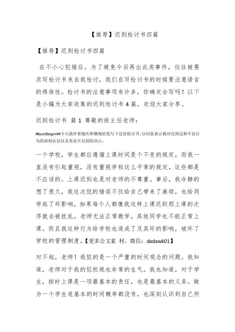 【推荐】迟到检讨书四篇【推荐】迟到检讨书四篇在不小心犯错后,为了避免今后再出此类事件,往往被要求写检讨书来自我检讨,我们在写检讨书的时候要注意语言的得体性。检讨书的注意事项有许多,你确定会写吗?以下是小编为大家收集的迟到检讨书4篇,欢迎大家分享。迟到检讨书篇1尊敬的班主任老师:郴paidbegin#今天我怀着愧疚和懊悔给您写下这份检讨书,以向您表示我对迟到这种不良行为的深刻认识以及再也不迟到的决心。一个学校,学生都应遵循上课时间是个不变的规定,而我一直没有引起重视,没有重视学校这么平常的规定,这些都是不应该的。上课迟到也是对老师的不尊重。事后,我冷静的想了很久,我这次犯的错误不仅给自己带来了麻烦,也给同学起了坏影响,如果每个人都像我这样上课迟到那上课的次序就会被扰乱,老师无法正常教学,其他同学也不能正常上课。而且我这种行为给学校也造成了及其坏的影响,破坏了学校的管理制度。【更多公文素材,微信:dadawk01】对不起,老师!我犯的是一个严重的时间观念的问题。我知道,老师对于我的犯校规也非常的生气。我也知道,对于学生,按时上课是一项最基本的责任,也是最基本的义务。做为一个学生连基本的时间概率都没有,也深刻认识到自己所