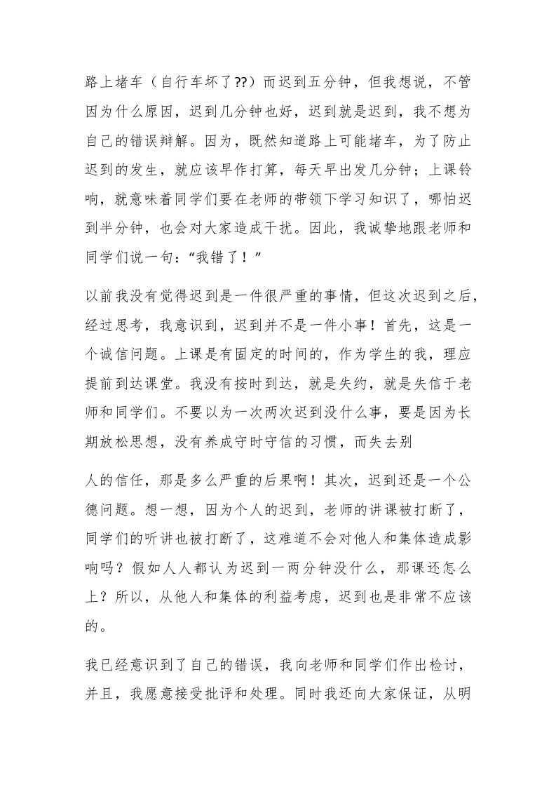 【推荐】迟到检讨书模板汇总九篇【推荐】迟到检讨书模板汇总九篇在有过错的情况下,为了避免今后再出现此类事件,需要写检讨书来好好地检讨,写检讨书的时候一定要有承认错误的意识。那么正式、规范的检讨书是什么样的呢?以下是小编收集整理的迟到检讨书9篇,仅供参考,希望能够帮助到大家。迟到检讨书篇1#paidbegin#尊敬的老师:最近不知道什么原因,一向起很早的我最近就起不来了,一天特别困,早上起床就已经迟到了,跑来教室还是个迟到…而且觉得自己很是点背,每次来的很早老师就不查,偶尔来晚就一定会抓到我,我觉得真的是很愁人,很无奈但是,因为我这已经不是第一次迟到了,我接受老师的批评,做深刻的检讨,我知道这次我错了,以后再也不迟到了,我真的错了,真的.以后我保证自我监督,再也不迟到了,真的…迟到检讨书篇2【更多公文素材,微信:dadawk01】尊敬的老师和同学们:今天上课我迟到了。首先,我想承认我的错误。虽然我因为