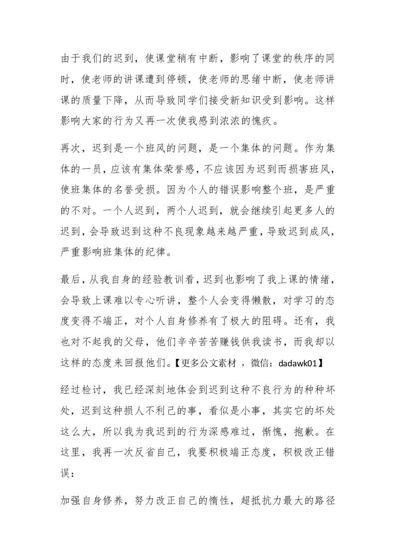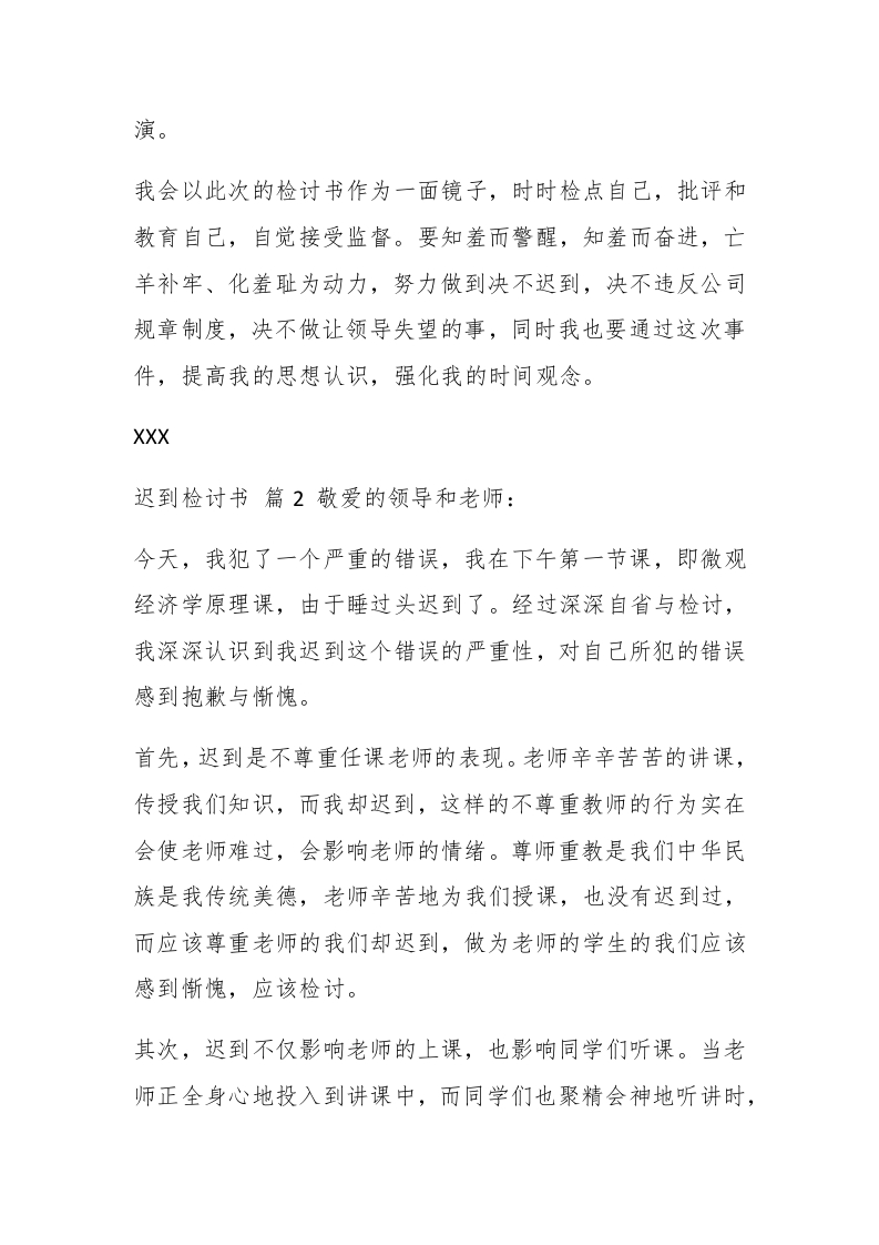 【推荐】迟到检讨书汇编十篇【推荐】迟到检讨书汇编十篇在不小心犯错后,为了表明自己悔改的决心,我们要通过写检讨书来悔过,请注意检讨书里面要交代清楚行为。你所见过的检讨书是什么样的呢?以下是小编整理的迟到检讨书10篇,欢迎大家分享。迟到检讨书篇1尊敬的XX:郴paidbegin#通过这件事,我感到这虽然是一件偶然发生的事情,但同时也是长期以来对自己放松要求,工作做风涣散的必然结果,这种不良思潮的最直接表现就是自由散漫!在这件事中,我还感到,自己在工作责任心上仍就非常欠缺。在自己的思想中,仍就存在得过且过,混吃混喝的应付思想。现在,我深深感到,这是一个非常危险的倾向!如果放任自己继续放纵和发展,那么,后果是极其严重的,甚至都无法想象会发生怎样的工作失误。我对我个人所犯下的这个严重错误感到痛心疾首,感到无比遗憾,感到非常可耻,感到无以复加的后悔与悲痛。此外,我也看到了这件事的恶劣影响,如果在工作中,大家都像我一样自由散漫,漫不经心,那怎么能及时把工作落实好。做好呢。同时,如果在我们这个集体中形成了这种目无组织纪律观念,不良风气不文明表现,我们工作的提高将无从谈起,服务也只是纸上谈。因此,这件事的后果是严重的,影响是恶劣的。为了严肃法纪,也为了让公司广大员工从此不要再走我的老路犯下如我一样的罪行,我衷心希望公司全体员工以我为反面教材,拿我做一面黑色的镜子,每天对照自己检查自己,倘能如此,我想今后类似的悲剧就不会再上