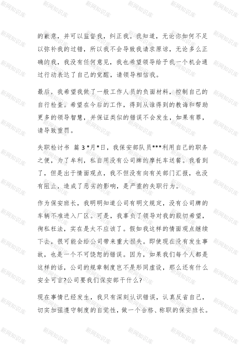 【热门】失职检讨书模板汇总七篇【热门】失职检讨书模板汇总七篇在有过错的情况下,为了避免今后再出现此类事件,我们要通过写检讨书来反省,请注意要带着改错的决心去写检讨书。那么问题来了,到底应如何写检讨书呢?以下是小编收集整理的失职检讨书7篇,希望能够帮助到大家。失职检讨书篇1尊敬的领导同志:郴paidbegin#您好,我怀着无比愧疚和遗憾的心情向您递交这份工作失职的检讨书。关于在杭州下沙物美超市的综合楼建设项目的监督工作中,因我个人的疏忽,我没有能够充分地对工程全部材料的样本可实品做样品检查。没有认真核查账本,也没有在检查之后向您如实汇报。我可以说是犯了一个最低级,最原则性的错误。我有罪啊,连这么基础的工作都没有做好,没有根据您的要求,把项目的进展情况着实地向了领导汇报。给公司造成了很大的负面影响,也导致了一些损失,同时也愧疚陈总对我的信任和关照。但此次我通过自我反省,必须找出我工作失误的根本原因,我反思了一下。我犯错的根本原因在于,我自身这个马虎的性格,做事半心半意,敷衍了事。我知道这样的工作作风是极度危险的,这样的作风持续下去。很可能在未来造成更多更严重的错误。针对我的错误,我反省了如下几点改正措施:1,针对我的责任感不强,工作作风懒散,不实际。我深刻认识到作为一名材料部的负责人,我对很多事情应该亲自过问,不论处理的好坏,都应该给上级一个明确的汇报和交代。出来端正态度,认真工作之外,我也要抽出空闲时间提高自己的学习和专业水平,同时保持工作的细节。2,我今后做事情必须严格要求自己,做一个认真负责,勤奋的工作人员。我要时时认真的了解组织领导的意图,不能将领导的意思偏之千里,要将自己的工作做好做精。通过此次深刻的检讨,请陈总信任我。我今后一定认真努力地位公司做工作,为公司的发展献上自己微薄的一份力量。检讨人:王x失职检讨书篇2尊敬的领导:你好!