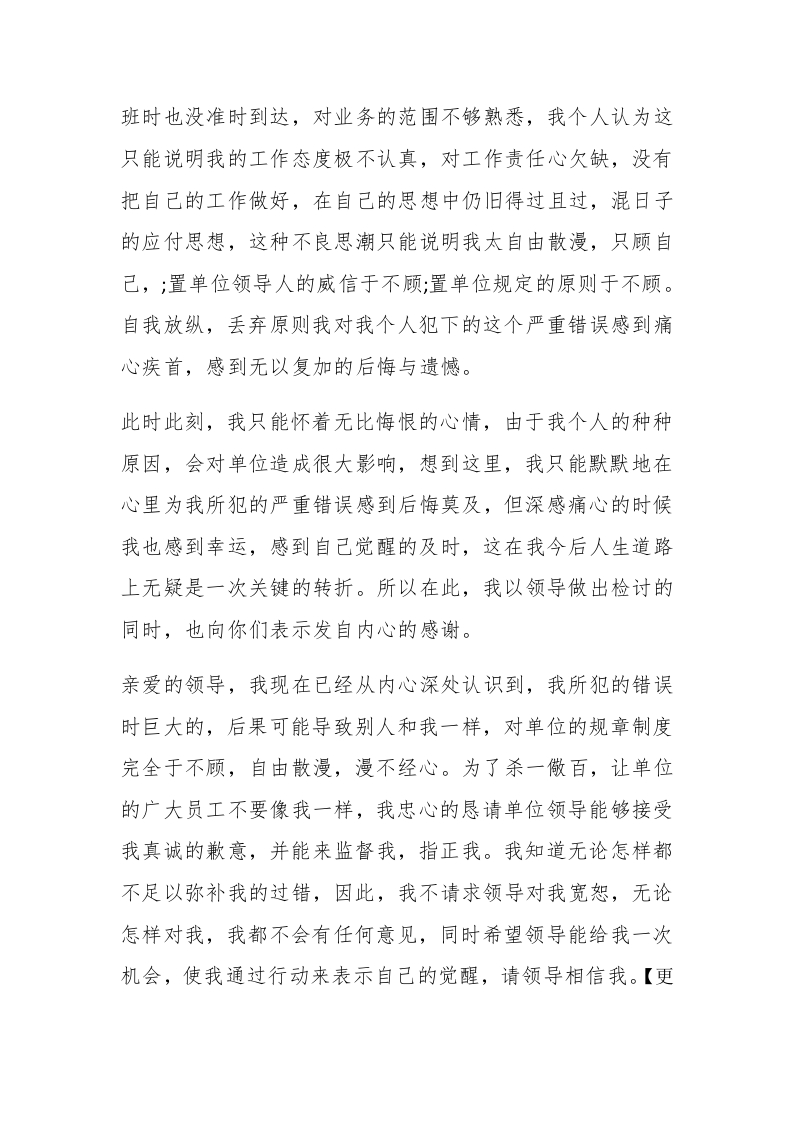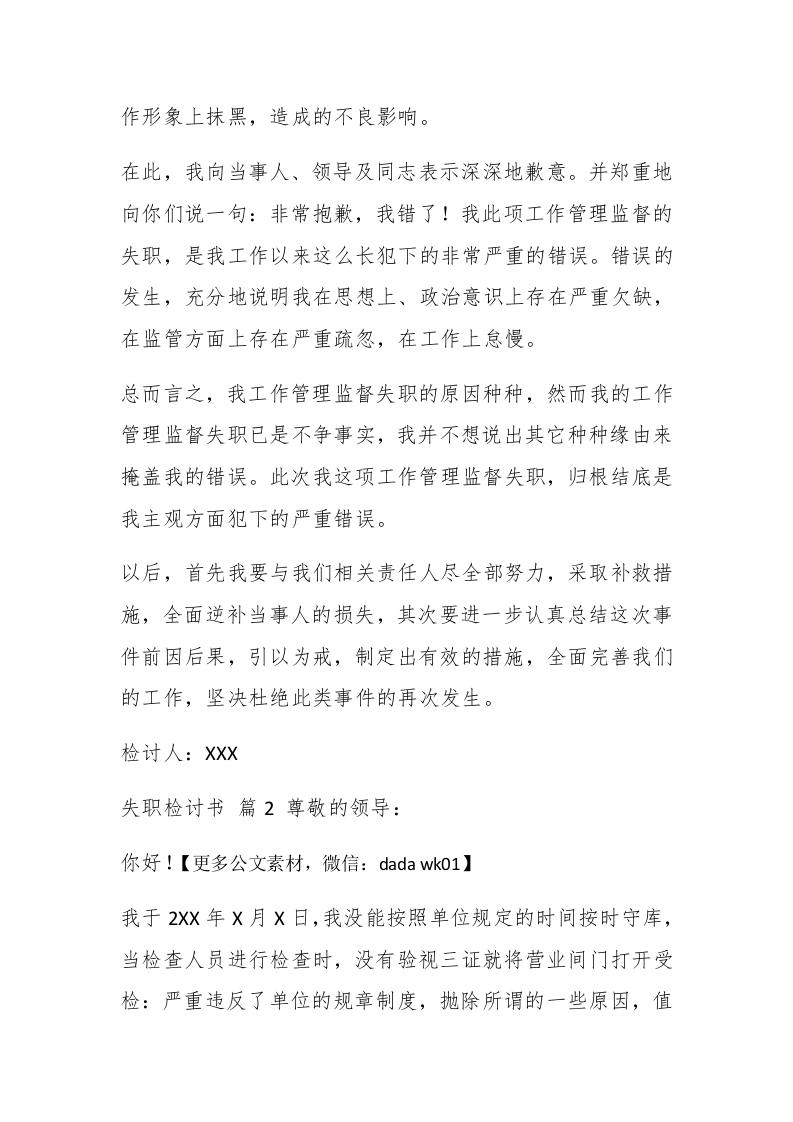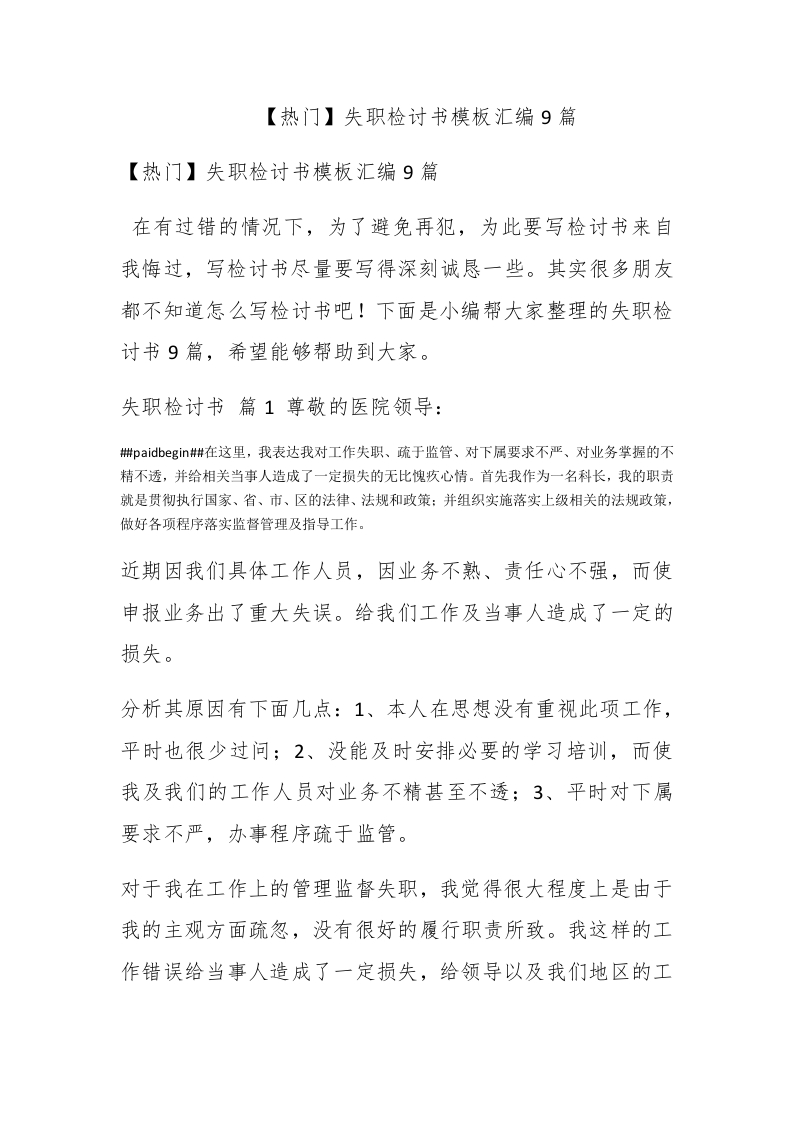 【热门】失职检讨书模板汇编9篇【热门】失职检讨书模板汇编9篇在有过错的情况下,为了避免再犯,为此要写检讨书来自我悔过,写检讨书尽量要写得深刻诚恳一些。其实很多朋友都不知道怎么写检讨书吧!下面是小编帮大家整理的失职检讨书9篇,希望能够帮助到大家。失职检讨书篇1尊敬的医院领导:#paidbegin特在这里,我表达我对工作失职、疏于监管、对下属要求不严、对业务掌握的不精不透,并给相关当事人造成了一定损失的无比愧疚心情。首先我作为一名科长,我的职责就是贯彻执行国家、省、市、区的法律、法规和政策:并组织实施落实上级相关的法规政策,做好各项程序落实监督管理及指导工作。近期因我们具体工作人员,因业务不熟、责任心不强,而使申报业务出了重大失误。给我们工作及当事人造成了一定的损失。分析其原因有下面几点:1、本人在思想没有重视此项工作,平时也很少过问;2、没能及时安排必要的学习培训,而使我及我们的工作人员对业务不精甚至不透;3、平时对下属要求不严,办事程序疏于监管。对于我在工作上的管理监督失职,我觉得很大程度上是由于我的主观方面疏忽,没有很好的履行职责所致。我这样的工作错误给当事人造成了一定损失,给领导以及我们地区的工
