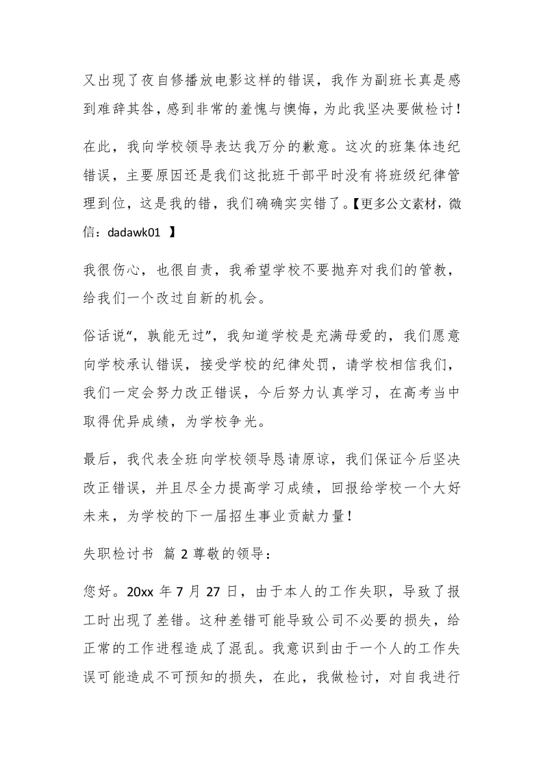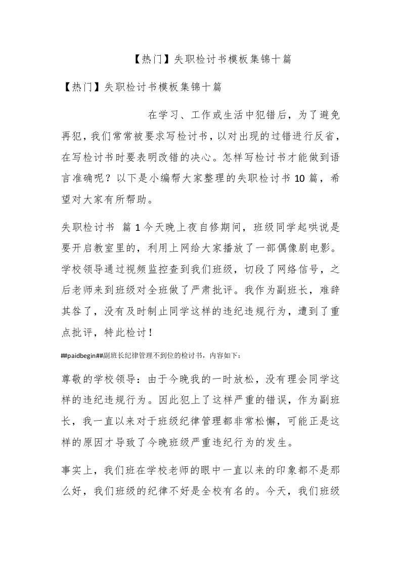【热门】失职检讨书模板集锦十篇【热门】失职检讨书模板集锦十篇在学习、工作或生活中犯错后,为了避免再犯,我们常常被要求写检讨书,以对出现的过错进行反省,在写检讨书时要表明改错的决心。怎样写检讨书才能做到语言准确呢?以下是小编帮大家整理的失职检讨书10篇,希望对大家有所帮助。失职检讨书篇1今天晚上夜自修期间,班级同学起哄说是要开启教室里的,利用上网给大家播放了一部偶像剧电影。学校领导通过视频监控查到我们班级,切段了网络信号,之后老师来到班级对全班做了严肃批评。我作为副班长,难辞其咎了,没有及时制止同学这样的违纪违规行为,遭到了重点批评,特此检讨!郴paidbegin#副班长纪律管理不到位的检讨书,内容如下:尊敬的学校领导:由于今晚我的一时放松,没有理会同学这样的违纪违规行为。因此犯上了这样严重的错误,作为副班长,我一直以来对于班级纪律管理都非常松懈,可能正是这样的原因才导致了今晚班级严重违纪行为的发生。事实上,我们班在学校老师的眼中一直以来的印象都不是那么好,我们班级的纪律不好是全校有名的。今天,我们班级