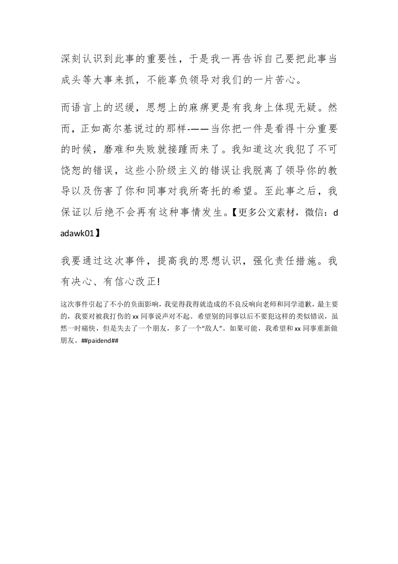 【热门】打架检讨书模板【热门】打架检讨书模板在某件事出现差错以后,为了避免再次出现相同情况,为此要写检讨书来自我反省,做事不能马虎,写检讨书也应如此。那么问题来了,到底应如何写检讨书呢?以下是小编帮大家整理的打架检讨书,希望能够帮助到大家。打架检讨书#paidbegin#尊敬的XX:你好!我怀着十二万分的愧疚以及十二万分的懊悔写下这份检讨书,以向您表示我对叫人打架这种恶劣行为的深痛恶绝及决心。今天下午,我和x发生了口角,由于一时冲动,我把x打伤了,事后想想,这次打架我有很大的责任,我不应该因为他先挑衅我而失去控制,让冲动控制我的理智;我也不应该想当然的认为武力才是解决同事间矛盾的最佳方法。早在我们刚踏进这个工厂的时候,您就已经三令五申,一再强调:全厂同事有了矛盾,自己解决不了可以找我,绝对不可以叫人,不可以掺杂社会成分。其实,领导你的反复教导言犹在耳,严肃认真的表情犹在眼前,我深为震撼,也已经