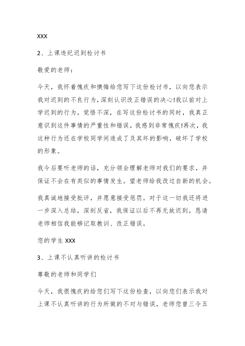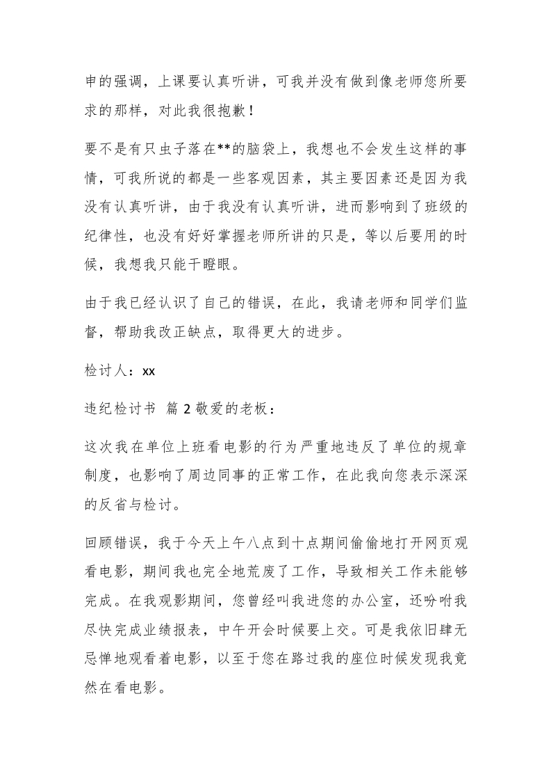 【热门】违纪检讨书集锦七篇【热门】违纪检讨书集锦七篇在学习、工作或生活中出现了失误后,为了防止此类事情再度出现,需要写检讨书来好好地检讨,在写检讨书的时候要注意语言真挚。相信大家又在为写检讨书犯愁了吧!下面是小编帮大家整理的违纪检讨书7篇,欢迎阅读与收藏。违纪检讨书篇11、上课违纪说话检讨书#paidbegin#尊敬的老师:【更多公文素材,微信:dadawk01】今天,我怀着深深的愧疚以及十二万分的懊悔给您写下这份检讨书,以向您表示我对上课讲话这种恶劣行为的深痛恶绝及以后上课要专心听讲的决心。上课的时候,老师在认真的给我们学生讲课,而我没有认真听讲,而是和其他同学在下面说话,更严重的是还若无其事的发出笑声,完全没有尊重老师,不仅打扰了别的同学听讲,还影响了老师讲课的好心情。我想我以后上课再也不说话了,影响了其他同学会搞坏同学之间的关系‘惹了老师生气会挨批评。下次老师在讲台上讲课,我要专心的听,认真的去学,保证有质有量。【更多公文素材,微信:dadawk01】