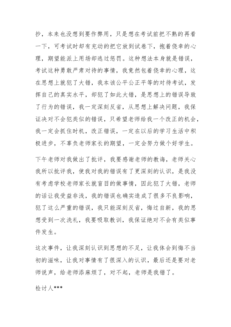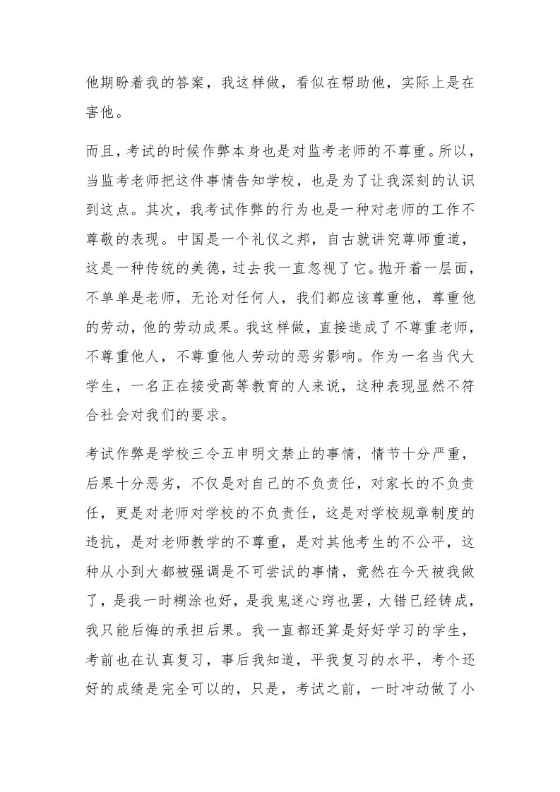 【精华】作弊检讨书模板集合6篇【精华】作弊检讨书模板集合6篇在某件事出现差错以后,为了避免再次出现相同情况,为此要写检讨书来自我反省,请注意写检讨书要注意正确的格式。其实很多朋友都不知道怎么写检讨书吧!下面是小编整理的作弊检讨书6篇,仅供参考,大家一起来看看吧。作弊检讨书篇1郴paidbegin#尊敏的老师:【更多公文素材,微信:dadawk01】我由于在考试的时候写答案给我别的同学,造成了作弊行为,当时监考老师对我进行了教育,但是本人还未认识到这件事情的严重性,于是监考老师将此事告知系里,希望系里老师能教育我。在学校老师的教育和同学们的帮助下,我终于意识到自己犯的错误的严重性。错误的性质是严重的。我在考试的时候写答案于小纸条上,并且试图将其传给其他的同学,这是有悖学生的行为,其结果损害了多方利益,在学校造成极坏的影响。这种行为,即使是并没有把答案传给别人,或者给别人答案,仍然是不对的,此举本身就是违背了做学生的原则。我只是顾着自己的利益,和一时的想法,完全不理会监考老师的感受。这也是不对的,人是社会的人,大家不应该只是想着自己,我这么做,害的那个是那个同学,