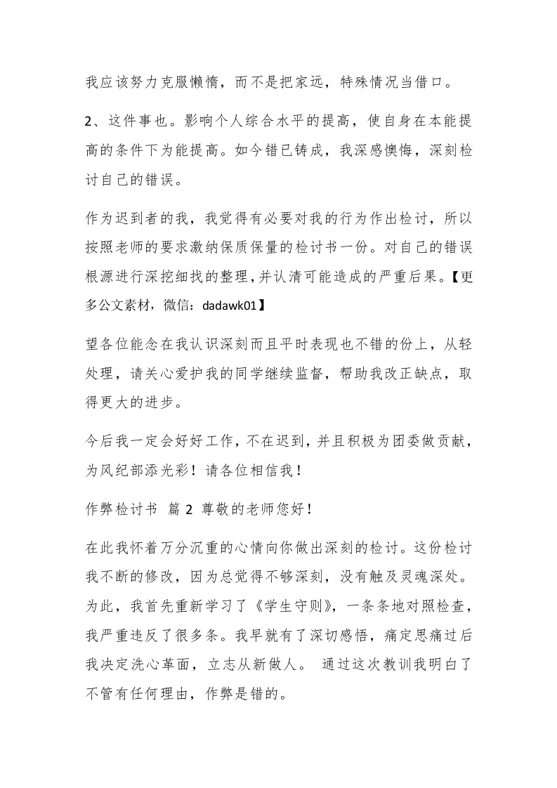 【精华】作弊检讨书范文7篇【精华】作弊检讨书范文7篇在某件事出现差错以后,为了避免再次出现相同情况,往往被要求写检讨书来自我反思,在写检讨书时犯错的原因要描述清楚。大家知道正规的检讨书怎么写吗?以下是小编收集整理的作弊检讨书7篇,仅供参考,大家一起来看看吧。作弊检讨书篇1今天,我怀着愧疚和懊悔向各位写下这份检讨书,以向各位表示我迟到这种行为的深刻认识以及不再迟到的决心。#paidbegin这是一次十分深刻的检查,我对于我这次犯的错误感到很惭愧,我真的不应该迟到,我不应该违背规定。我感到很抱歉,我希望各位可以原谅我的错误,我这次的悔过真的很深刻。不过,人总是会犯错误的,当然我知道也不能以此作为借口,我们还是要尽量的避免这样的错误发生,希望各位可以相信我的悔过之心。“人有失手,马有失蹄”。我的不良行为不是向规定进行挑战。绝对是失误,组织部长说的话很正确,就是想要犯错误也不应该再这种时候犯错误,我感到真的是很惭愧。相信各位看到我的这个态度也可以知道我对这次的事件有很深刻的悔过态度,我这样如此的重视这次的事件,希望各位可以原谅我的错误,我可以向各位保证今后一定不会迟到